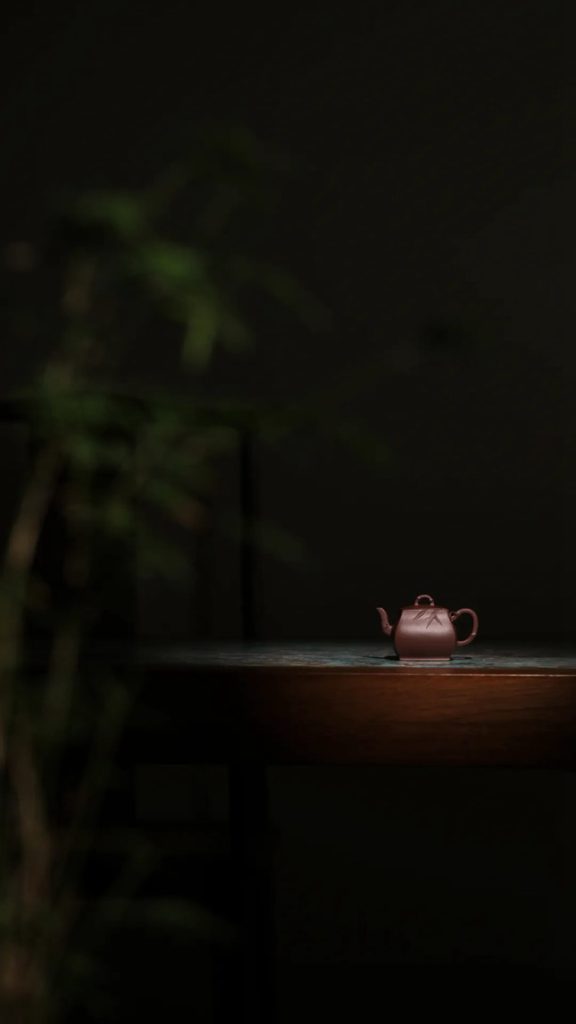 「静筠方士」此壶以四方碳炉为形,方壶身挺括规整,圆口盖柔化棱角,高足圈承托其间,刚柔相济,尽显端庄。流、把、钮皆以竹为题,壶把处一枝竹节顺势攀出,手工贴饰的竹叶舒展灵动,似有清风拂过。壶侧“竹里煎茶烟起”六字刻绘,笔力沉稳,与竹、炉之形呼应,精准点出文人茶室的闲逸景致。整器将竹之雅、炉之朴与茶之韵融于一壶,形意相生,尽显制壶者的匠心与文人情怀。