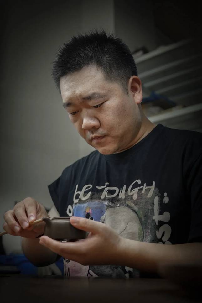 戴涛,一九九0年出生于陶都宜兴,二00九年毕业于工艺美术专业,国家级助理工艺美术师。二0一0年开始跟随高级工艺美术师陆君、正高级工艺美术师范建华夫妇学习传统紫砂壶制作技艺,期间又得吕尧臣、江建翔、曹婉芬等名师指点。二0一二年获江苏省工艺美术精品博览会银奖;二0一二年获全手工紫砂壶比赛三等奖;二0一四年获第十六届中国(国家级)工艺美术大师精品博览会金奖;二0一九年获中国江苏乡土人才技艺技能大赛三等奖。