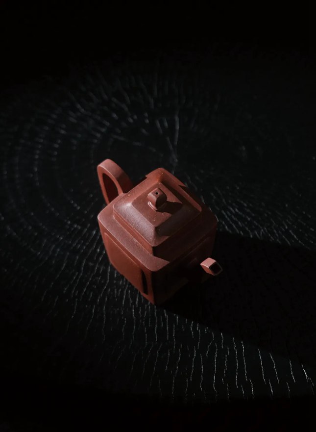 魁方以魁伟刚正、方直挺拔为紫砂方器中之重器。此摹古之作轮廓周正,八点四面镶接而成,点、线、面利落明快,比例恰到好处,挺拔有力,刚直不阿。每面装饰圆角凸方块,方圆相济,更显张力。方颈、平盖,壶盖四方凸起,呈昂扬之势;流、把四方,古朴自然。似谦谦君子,又若豪迈丈夫。