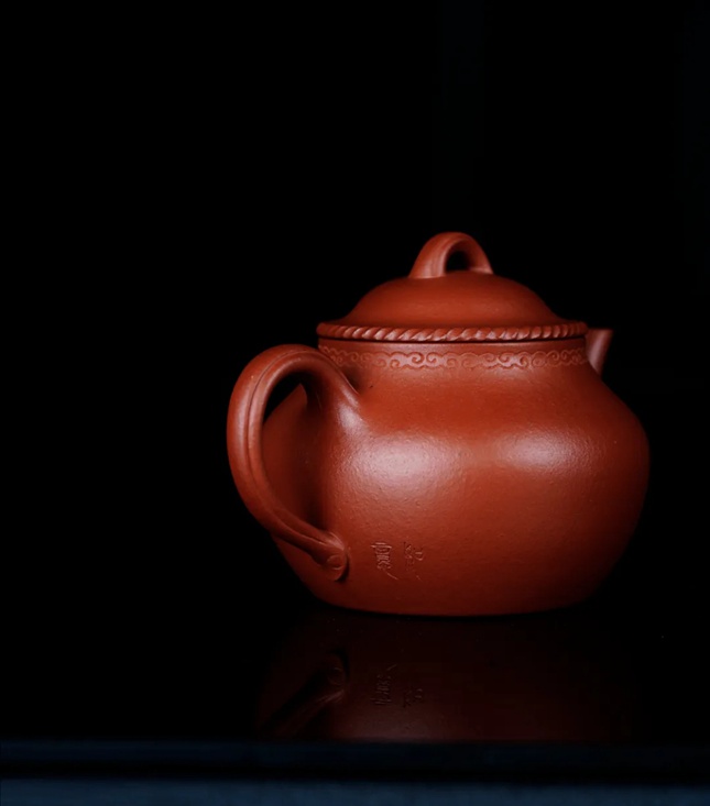 壶身似秋水之形,腴玉成韵,饱满圆润;壶盖穹起,盖钮作桥形,线条流畅如流云渡水;盖沿与壶口处饰以绞绳纹与如意云纹,绞绳纹缠绵如织,云纹流转似波,古意盎然间,添了几分雅致灵秀,暗合“如意”之吉意。壶流挺秀,壶把环曲与钮相合,整体圆融之态相得益彰,执握间仿若有古韵清风盈手。