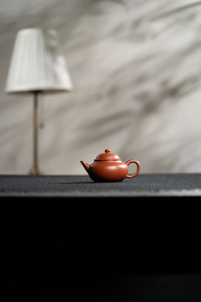 壶身圆融,形态虽小,气度不凡。压盖单圈,素简古朴。肩线与刹凹衔接自然,骨力神气尽现。盖隆起弧度自然饱满,与身相接,宛若一体。剑流昂扬有力,壶把由粗至纤,握感细腻。工巧兼备,格高思逸,秀而不媚。