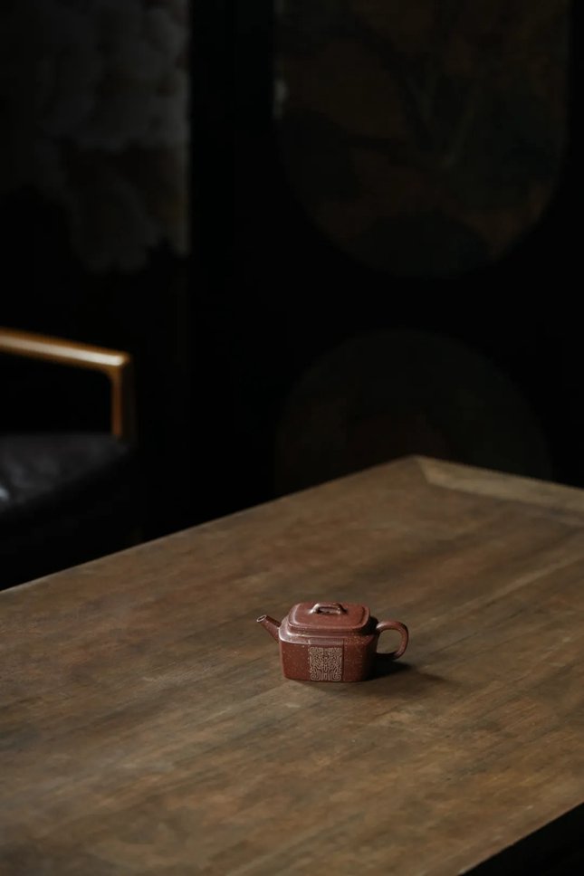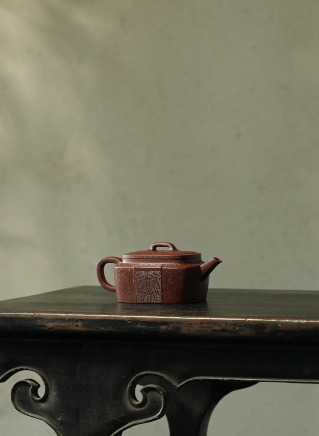 “卬卬,君之德也。”其以四方为形,颙颙而立,尽显君子气宇轩昂、神态不凡的精神风貌。线条明快厚润,直中带曲,如圭如璋,恰若美玉般高贵、纯净、温润且富有光泽。壶肩与壶身以银丝镶嵌云雷纹及兽面纹,铺砂似繁星点缀,更添神秘庄重之感。四方壶流与壶把皆出得刚强有力,弯把处似曲却含折角,将骨力与神气尽显无遗。
