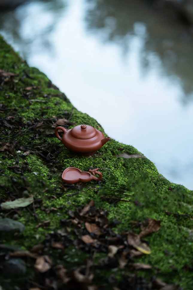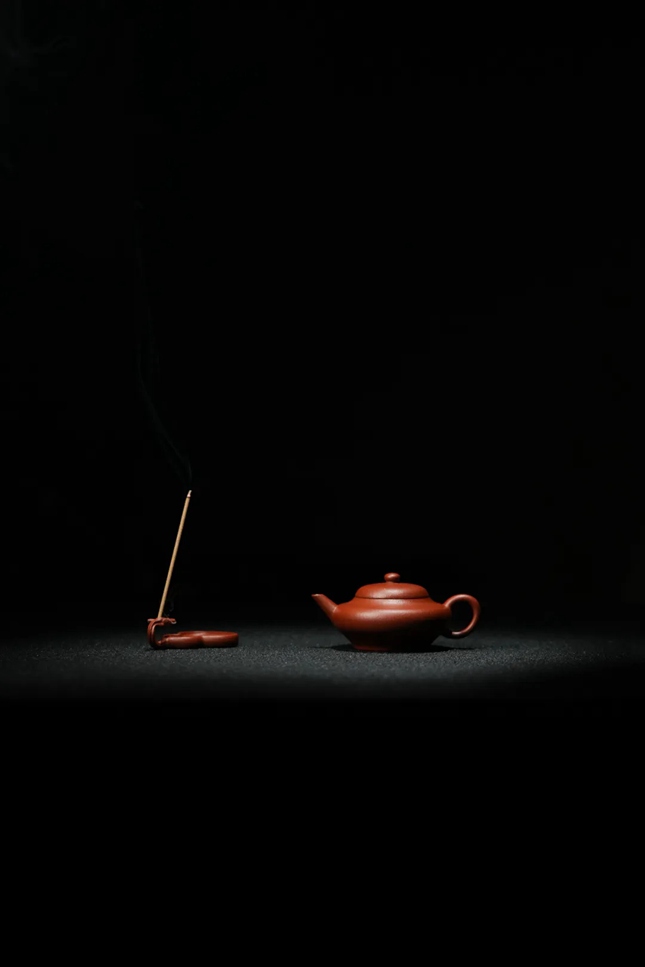 此器“水平”之平正与“虚扁”之求曲融合,一直一曲,动静相生。小煤窑朱泥,色泽红而不媚。壶身扁中有度,曲里含韵;扁而不塌,意态亭亭;截盖与壶身曲直相合,流把气韵贯通、机无滞碍。葫芦龙挂香插玲珑小巧、生动活泼,点一炷香,泡一壶茶,静坐瀹茗,涤世间纷扰。