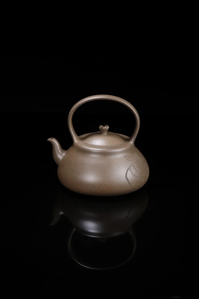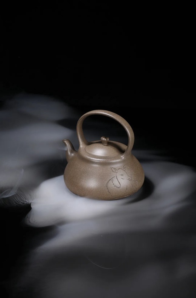 观月泉,赏壁画,心有所感,作水月提梁。提梁月牙泉之形,弯若新月浮空;壶嘴拟流沙之态,婉如风拂大漠;盖承皓月倒影,圆融映碧;钮效泉眼之姿,深潜不竭,暗合千年不涸之妙。壶身刻九色神鹿,仿莫高窟壁画意。鹿性仁善,感于斯画,欲传其德以滋人心、启神智也。壶底铭“镜花水月,心中有路”。所谓心中之路,乃坚定之信念,明确之方向,不为外象所惑之定力也。