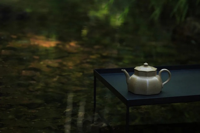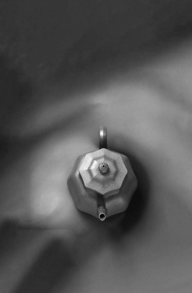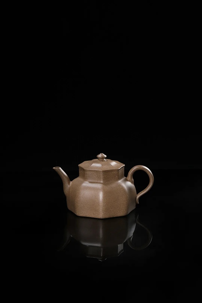 松风绕庐野径斜,云岫漫卷远尘埃。择清静地,守清宁心。塑心中之隐庐,寻得生命真性之归处。整器有一亭翼然于山间之感,具瓜棱瓶之形,凝宋式执壶之神,敛气于骨,气度内盈;八角方形,方中带圆;八面内凹,直中有曲。壶身端庄古雅,颈稍高而直;八角之盖由平缓而至隆起,与钮呼应;流微弯,流口外撇,耳形把,细细线条勾勒,典型的宋式执壶之形态,骨劲挺拔、修长轻盈;下实上虚,中实外虚,虚实间取古澹之势。