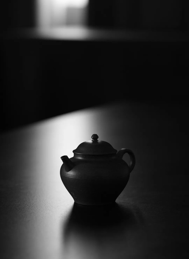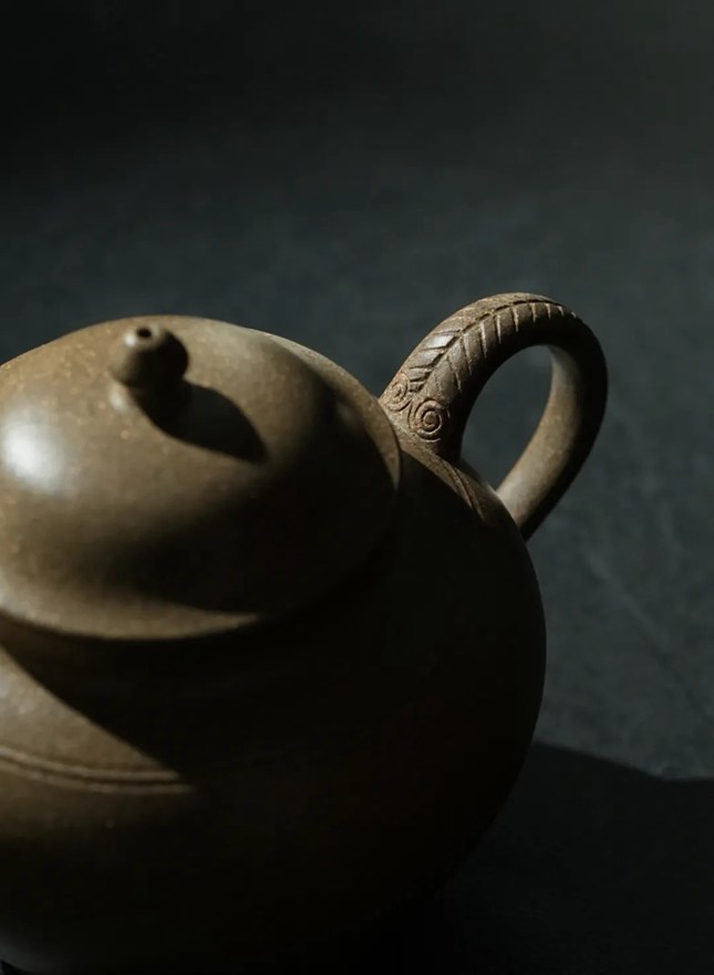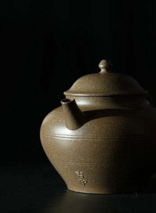 此壶取法西汉陶罐,肩阔底收、足口微喇,曲线灵动;盖隆钮巧,壶身弦纹拟汉罐之细腻。壶把以线刻羊纹(“羊”通“祥”),借四羊方尊秩序感显神韵且增实用性,壶嘴下以金文泥绘“吉羊”,配“罐”义寄吉祥富足愿景。