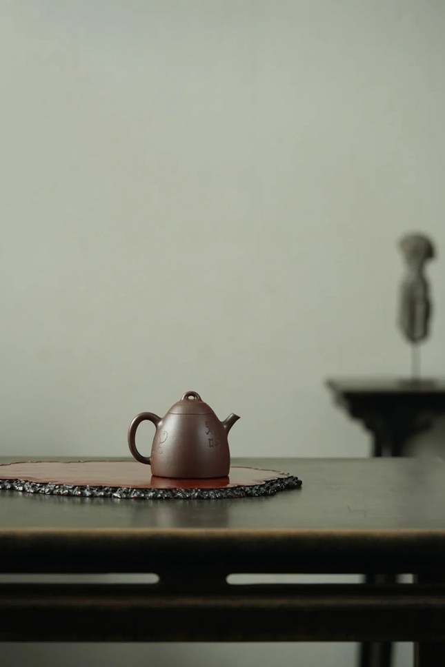 抟作者于甘肃敦煌见一“石权”,以此为灵感,取秦权之形制,融陇西苍莽之气韵,谓之“陇权”。壶身敦厚稳重,不务妍媚,朴雅坚栗,腹径宽博;流把曲直有度,有如西北大地一般沉静雄浑。