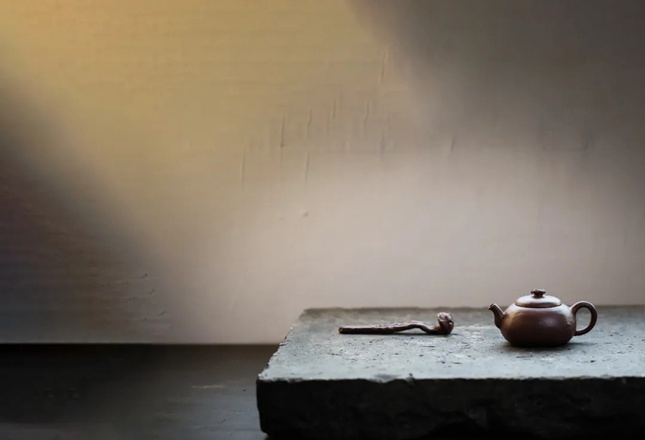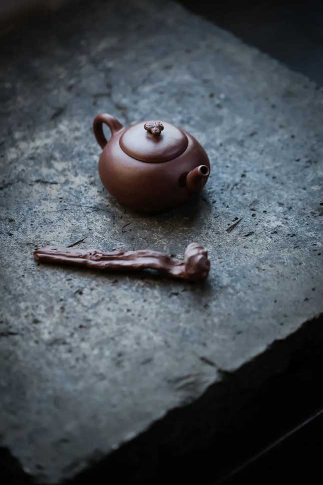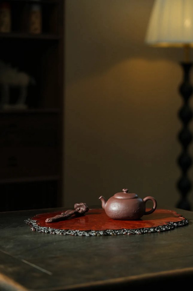 “无隅”象征包涵万物、超越局限的圆融境界,在无形无界的精神中找寻艺术生命之真。捏筑成型,敦实厚朴,不刻意规整,保留自然的痕迹,抱朴守拙,自本心源。流把搭配和谐统一,壶盖与壶身之饰似祥云又如灵芝,不落凡俗之境。