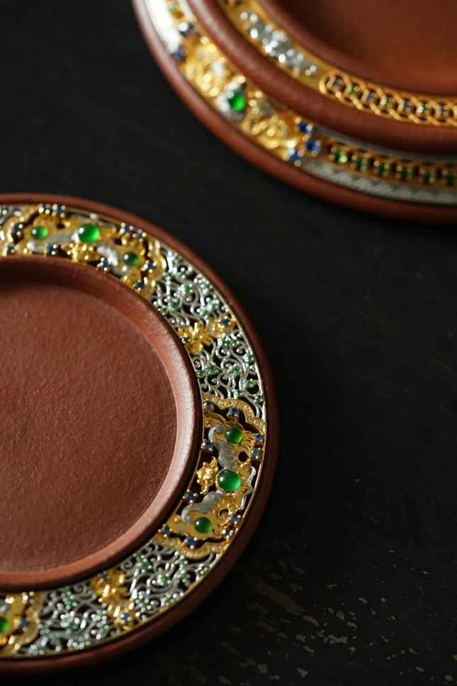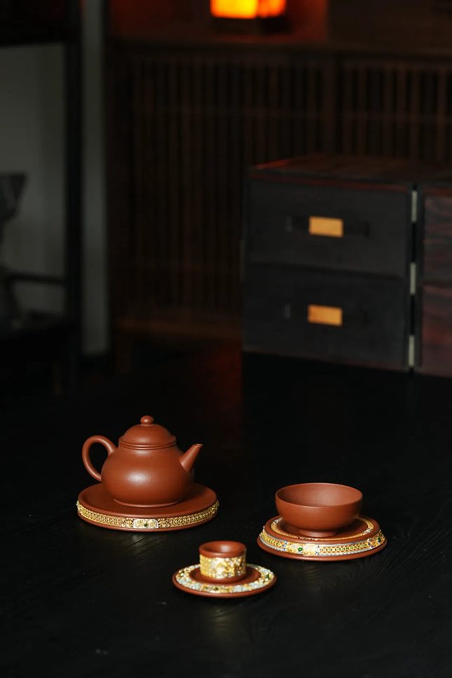 使装饰在壶承、盖置、杯垫上的纯金蝙蝠纹与宝石镶嵌成为视觉焦点,