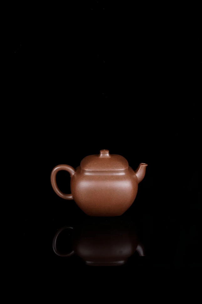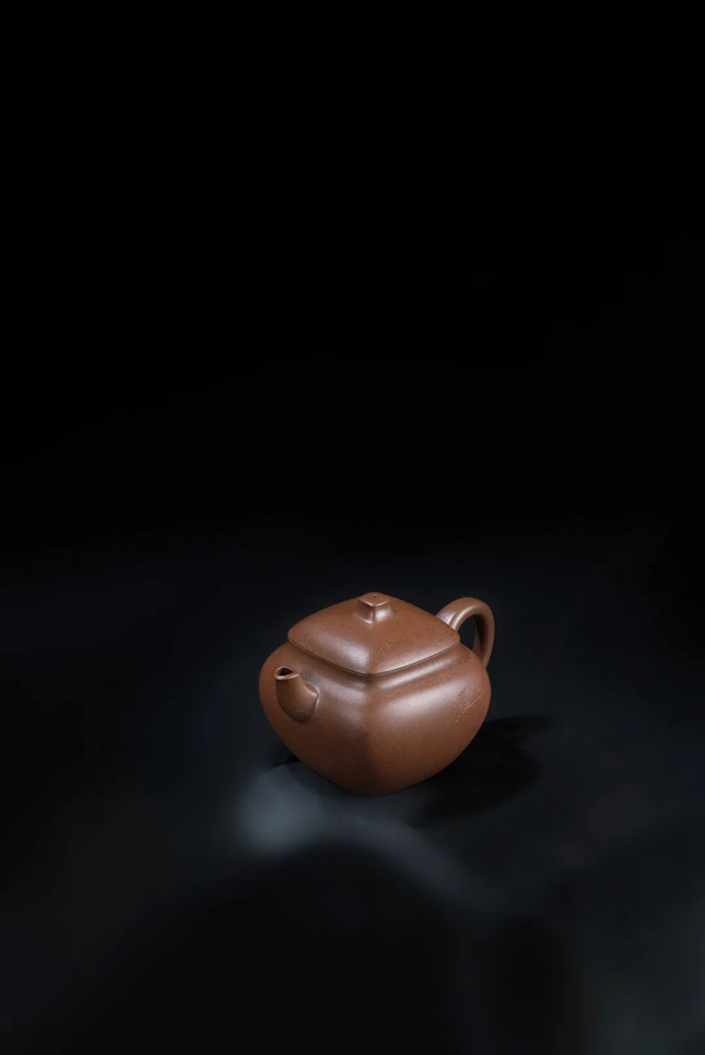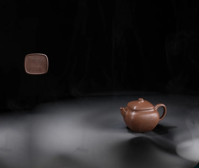 作者语:“清风徐来,壶中佳士。至于林中,落影壶上。”壶身四方之形,方中带圆,刚柔并济,高蹈出尘。似儒雅之士,有中庸之态。盖、颈、肩气韵贯通,开合间有广纳天地、浑然天成之感。滴钮盖状,胥出巧妙,线面弧度变化精微,底部更有妙想以竹节为饰,竹枝劲细,竹叶灵动,清幽而坚韧。壶身由王翔刻绘知了,更显文人清雅。