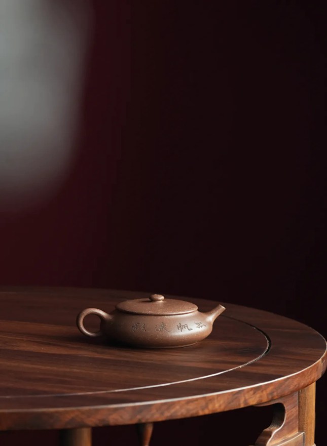 身扁口阔,腹圆而张,全器形简,古朴端庄。压盖若笠,配半丁镌刻“孤帆远影”,若老僧入定,静恬淡寂,无为自适。