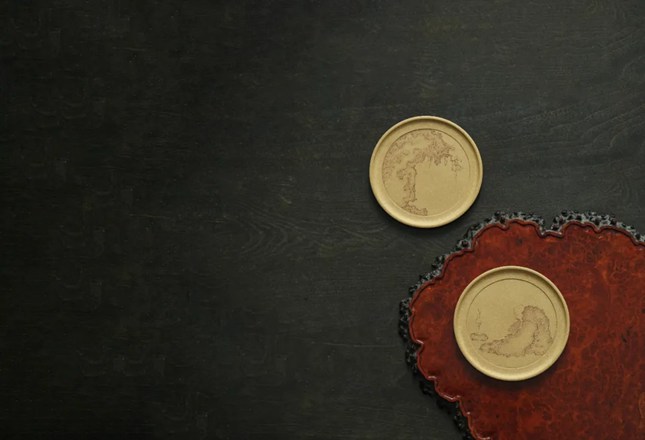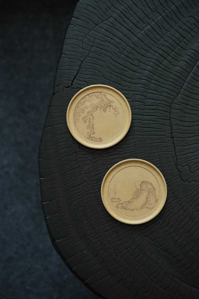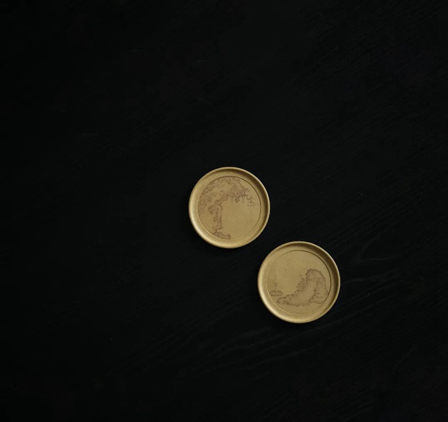 赏盘一对,一为“壁立千仞”,以刀代笔,皴染相接,崖壁主次疏密,明暗虚实,观之层叠而又崚嶒。