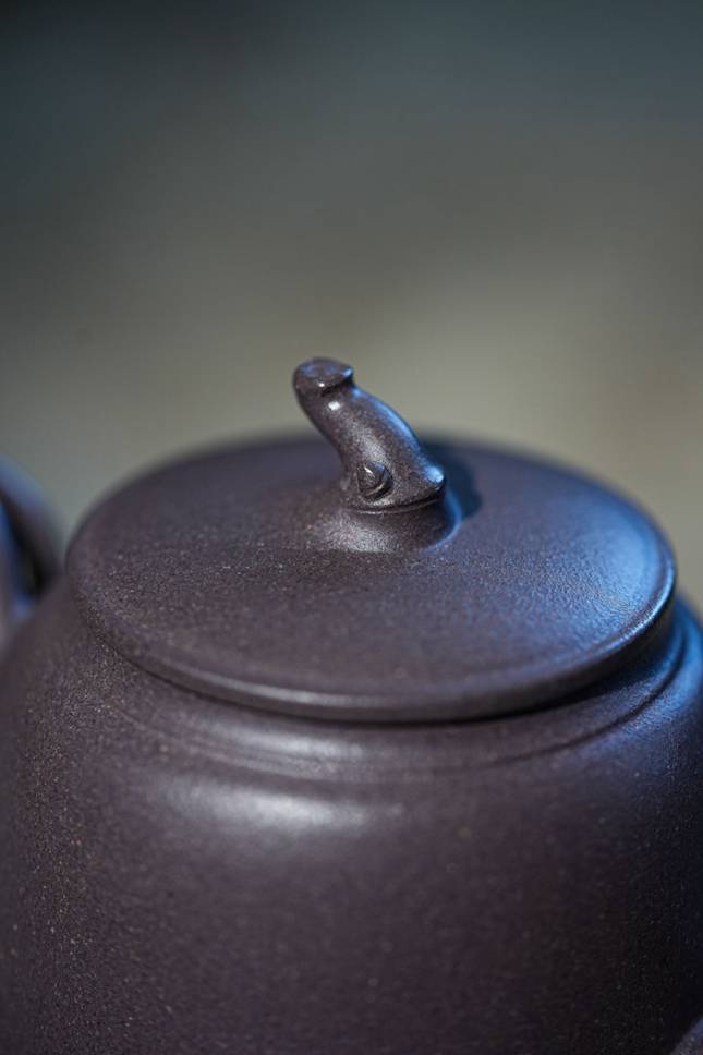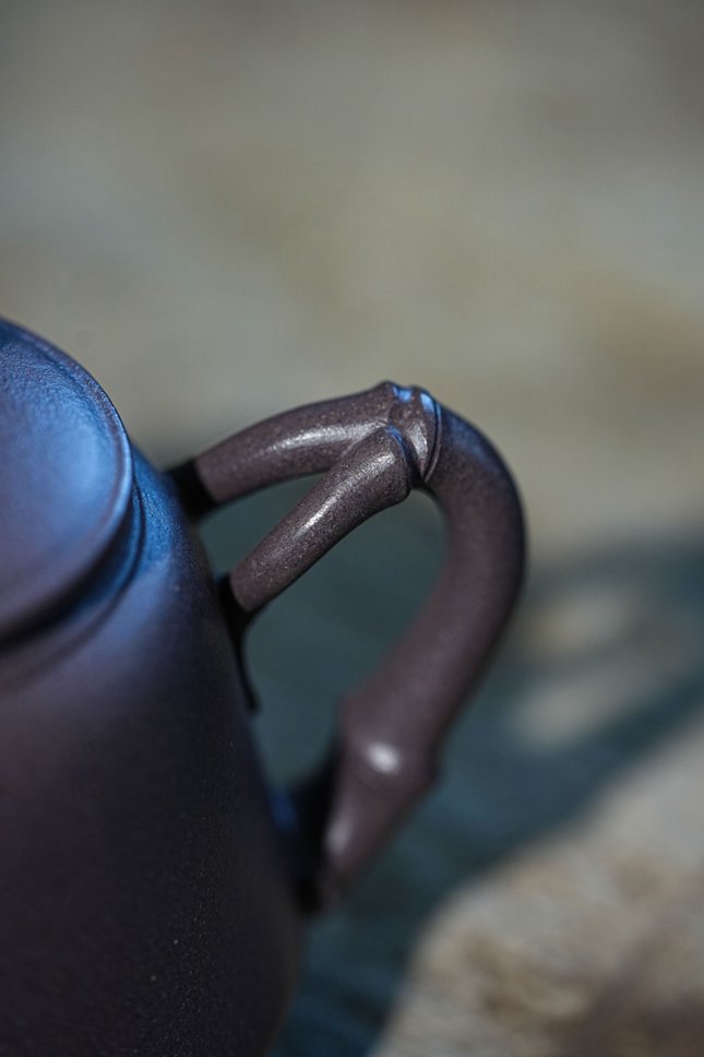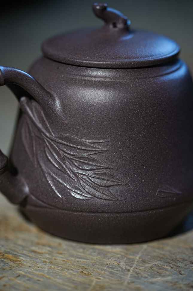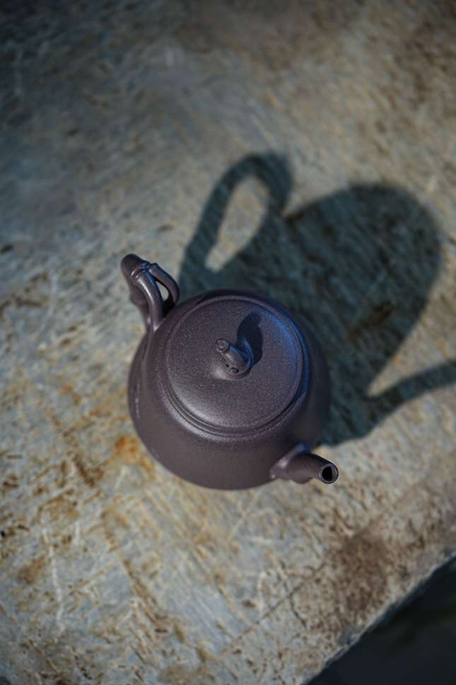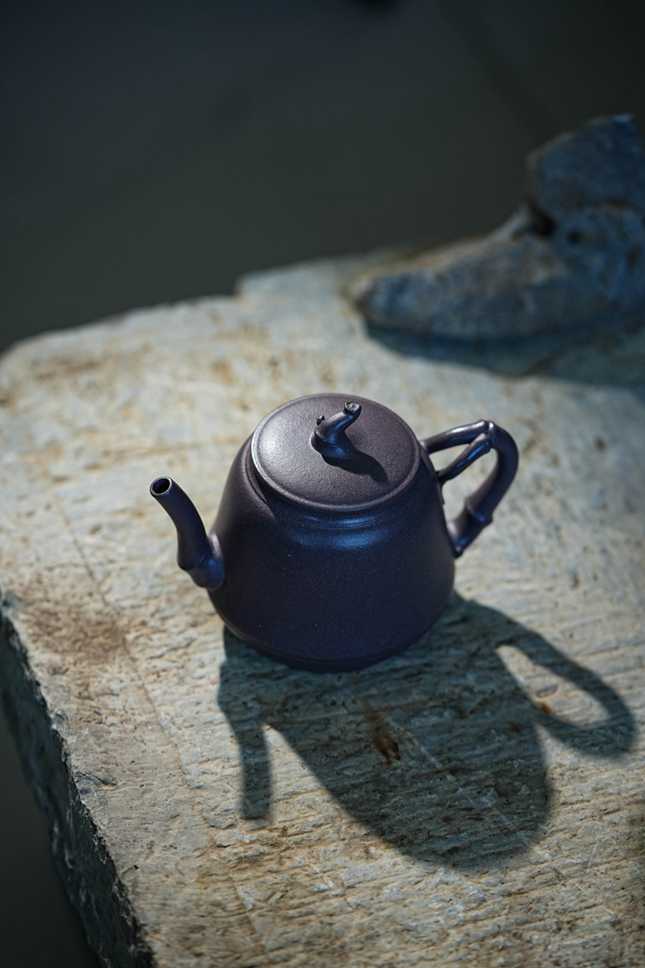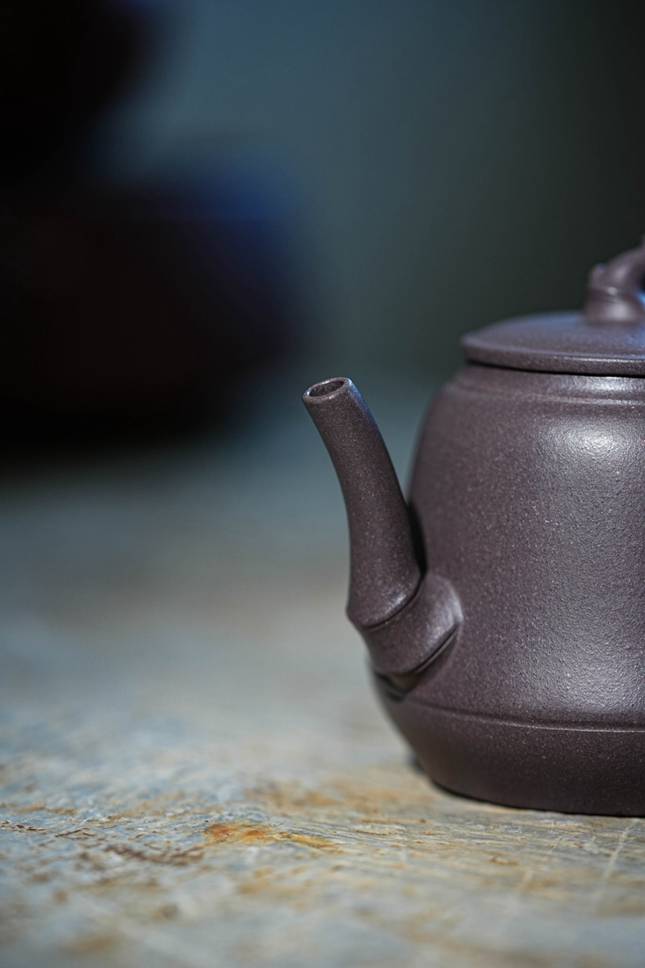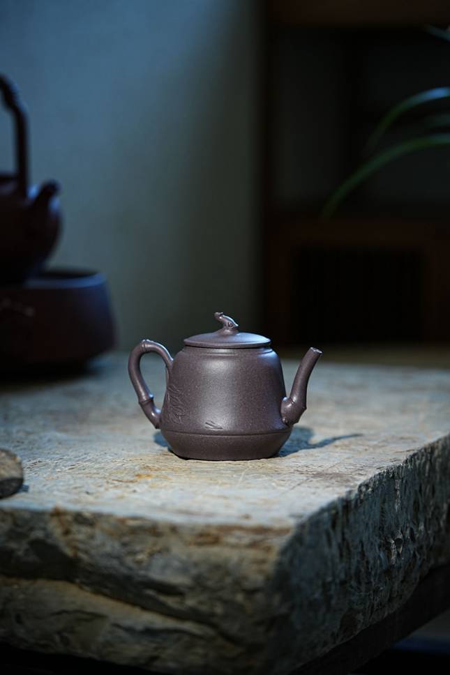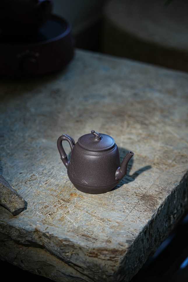 紫砂艺术,以泥为骨,以火为魂,在匠人指尖凝聚天地灵气。实力派紫砂艺人董俊峰先生,承名师冯伯明之艺脉,蒙省大师范洪泉悉心指点,其作品深得传统精髓而又独具风骨。这款《凌风》壶,便是其匠心独运的精彩呈现。壶以180cc之雅量,甄选上乘青灰泥,泥色沉静如古潭幽墨,质感温润似玉隐光华,抚之细腻生温。整器以竹为魂,将竹之灵秀清劲凝于方寸:壶身端庄挺拔,流、把、钮皆取竹节意态,弯折勾勒,线条流畅自然,仿若一竿青竹迎风而立,气韵生动;壶身浅雕竹叶数片,叶脉纤细可辨,似有清风拂过,簌簌有声,平添几分文人雅趣。器型比例精妙,握于掌中,贴合舒适,实用与审美完美交融。注水时水流如丝,断水利落;品茗间茶香氤氲,与紫砂肌理相融共生,日久养玩,必显温润包浆,愈显其深沉内敛之美。《凌风》一壶,不仅是一件工艺精湛的茶器,更是一件承载了竹之风骨与紫砂雅韵的艺术臻品,值得每一位藏家与爱茶人细细品味。