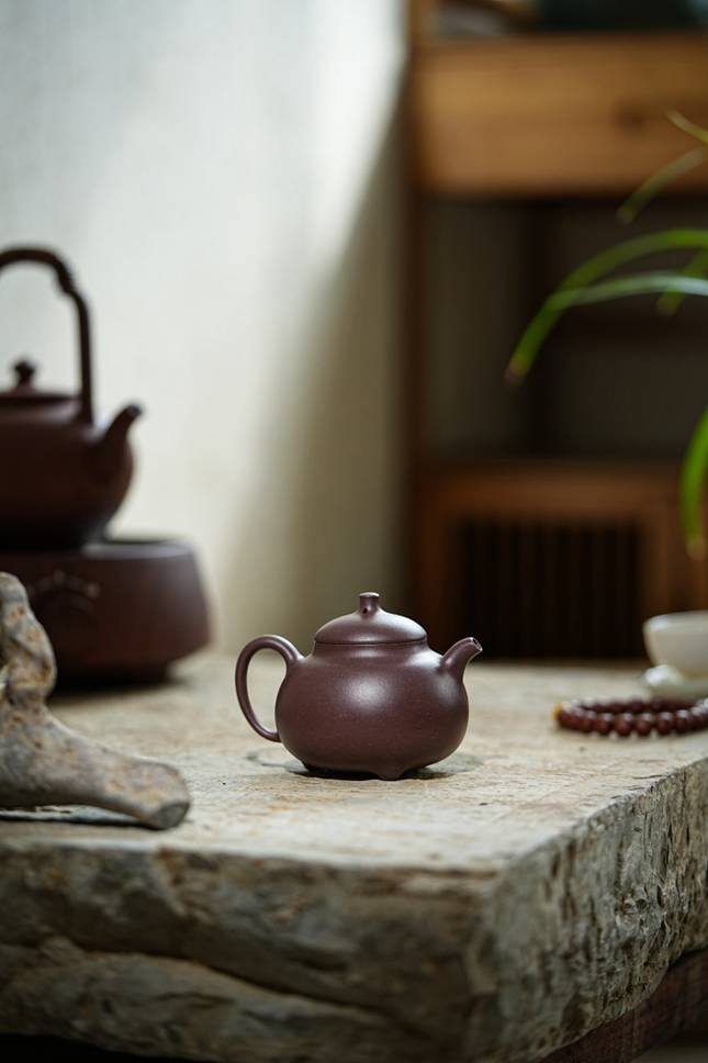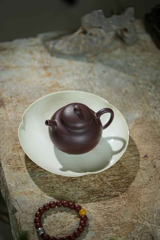 壶身圆融饱满,似乳蓄芳华,寓藏生命的温润与丰盈;三足鼎立,敦实稳重而不失灵巧,将鼎器固有的庄严气象,悄然化入茶席日常的闲适清欢,于刚柔并济、庄谐相生中,达成器物精神的微妙平衡。