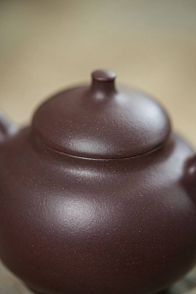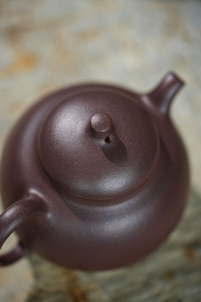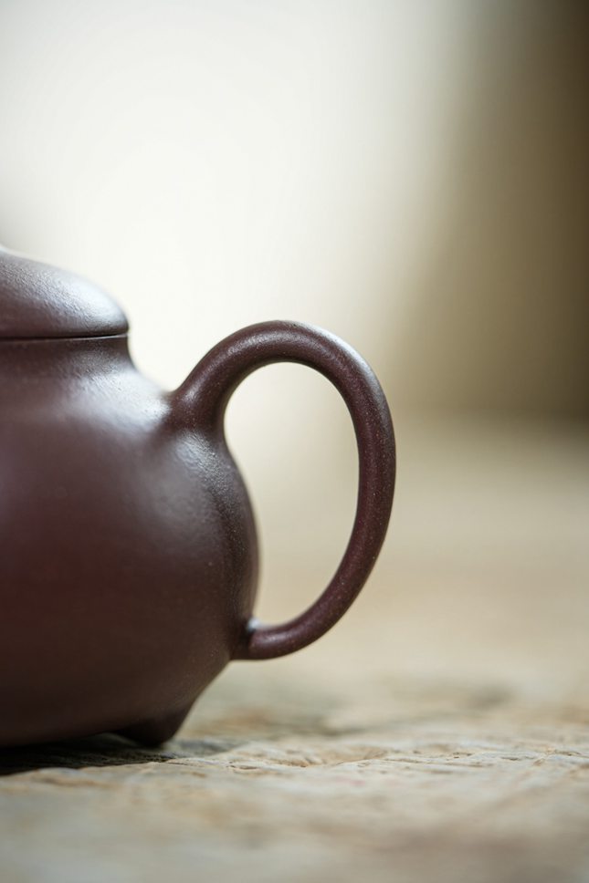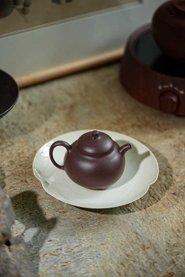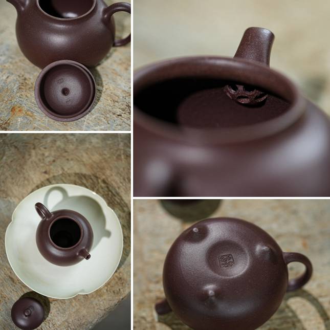 流嘴胥出自然,线条畅若溪泉,出水利落断水干脆;圈把曲度如新月衔云,执握时与掌心贴合无隙,尽显手工塑形之灵动匠心;盖钮小巧若珠,与壶身气韵贯通,内沿印款隐现,是匠人留给知音的精神注脚。壶内更设镂空茶滤,如花蕊吐芳,既保茶汤澄澈,亦暗藏实用巧思——方寸之间,步步见功夫,寸寸皆用心。此壶不独为沏茶良器,更是融合古韵与生趣、承载匠魂与文心的案头雅物。