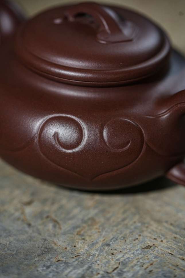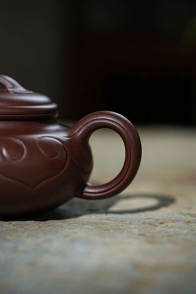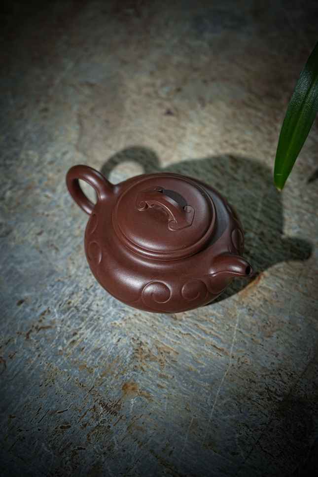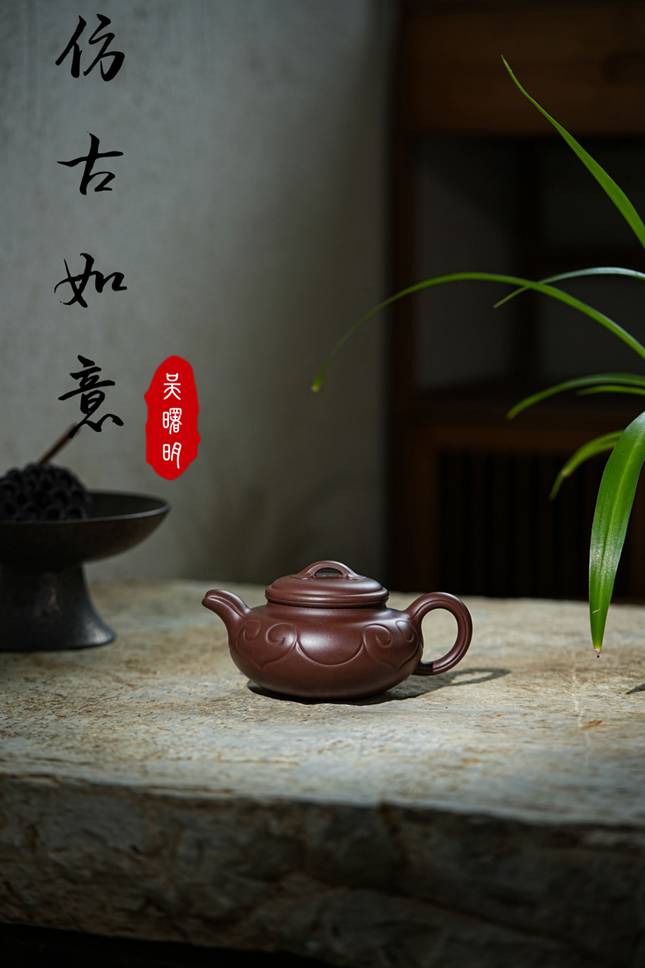 在紫砂艺术的星河中,实力派匠人吴曙明先生以其对传统器型的深邃理解与精湛表达熠熠生辉。作为景舟杯金奖得主并师从高旭峰先生,他的作品往往于经典骨架中注入鲜活的生命力,这款以优质底槽清精心抟造的“仿古如意”壶,便是其匠心传承与个人美学的完美映照。壶身取法经典仿古之韵,轮廓圆润饱满,线条自壶钮至壶腹一气呵成,流畅若秋水漾开微澜,静置于案便已气度自成。匠心独运处,在于将吉祥如意的纹饰巧妙融入壶体,那蜿蜒舒展的如意线条,宛若天际流云停驻壶身,不仅为古雅的器型平添一份灵动祥瑞的意趣,更寄托了顺遂安康的美好祈愿。