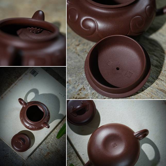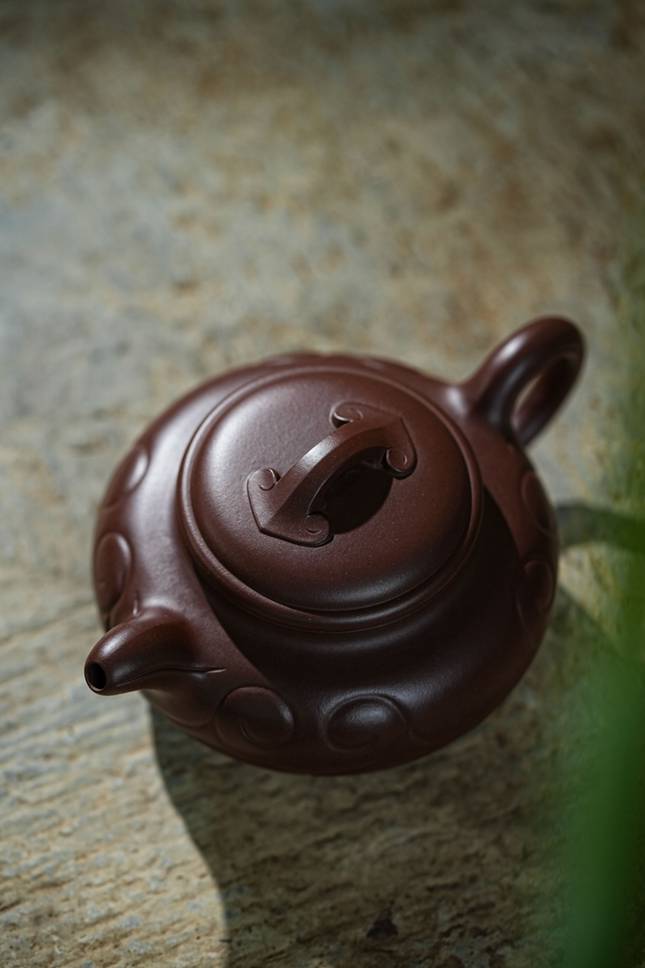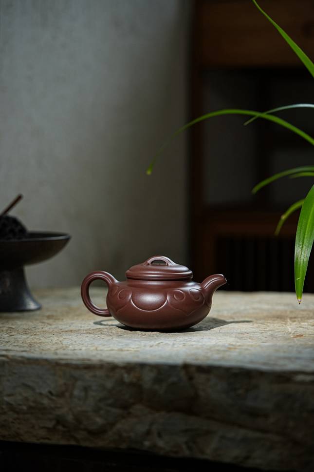 所选泥料砂质温腻,经窑火淬炼后色泽沉郁古朴,抚之如玉,润泽心生。实用方面亦毫不逊色:桥钮盖与壶身贴合紧密,拿捏舒适;出水爽利如瀑,断水则果决无声,在日常瀹茗中不仅能充分激发茶香、聚味锁韵,其优雅从容的姿态更为茶席空间注入一抹东方式的哲美。
