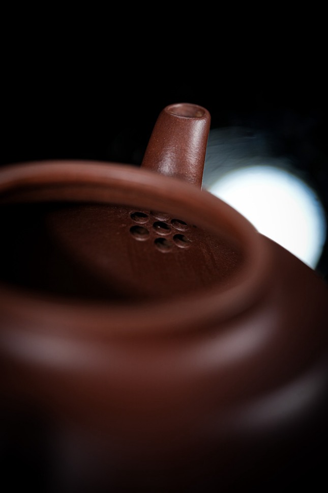 在紫砂艺术的天地里,张春兴先生的“清意”壶宛如一首凝练的静美诗篇。此壶精选黄龙山原矿底槽清为骨,这一深埋矿层的紫泥珍品,富含铁质与云母颗粒,经窑火淬炼后呈现出温润深沉的栗色,不仅气孔结构均匀确保了茶香不泄,更在日复一日的泡养中,仅三月便可初见包浆华彩,被资深茶客推崇为真正的“养茶利器”。