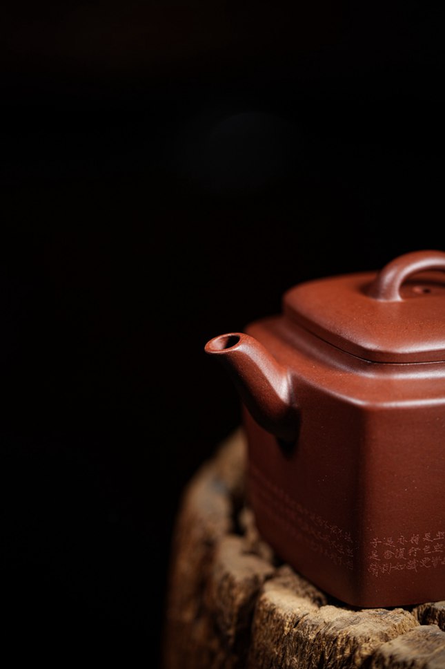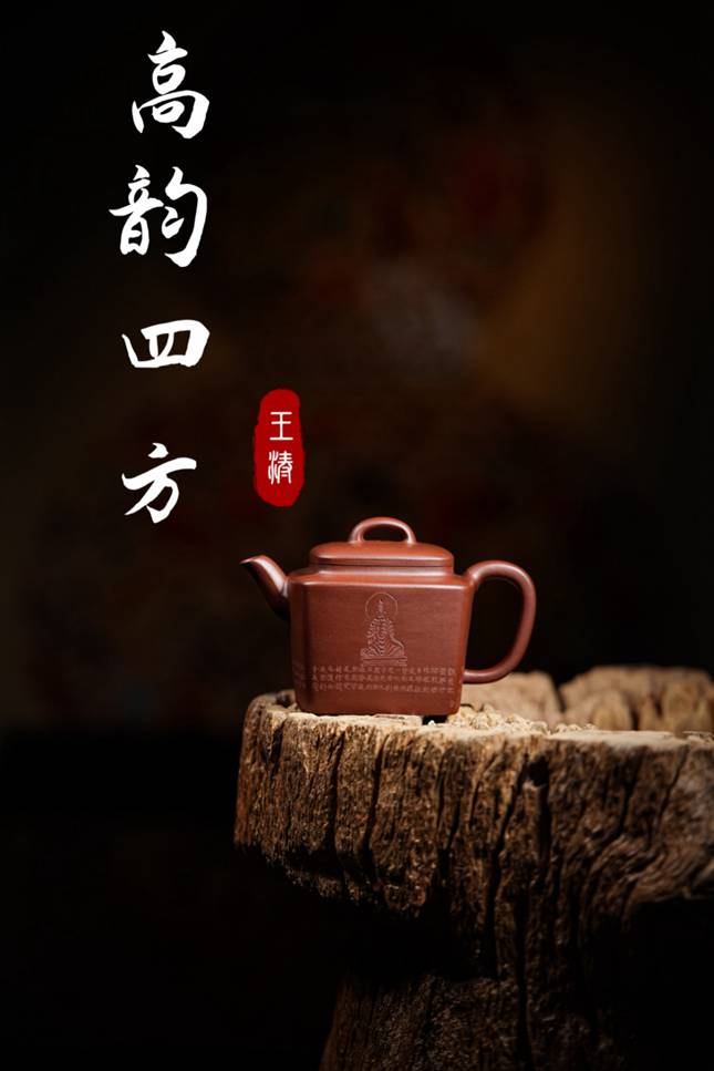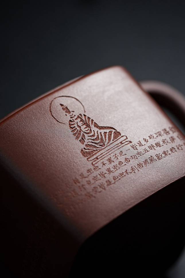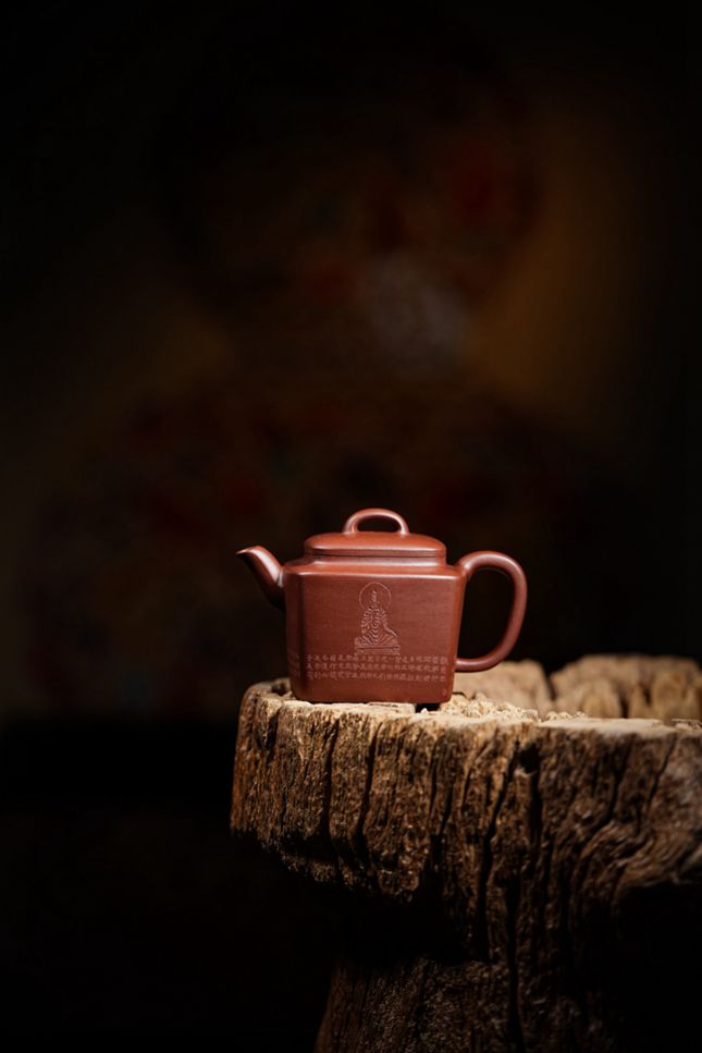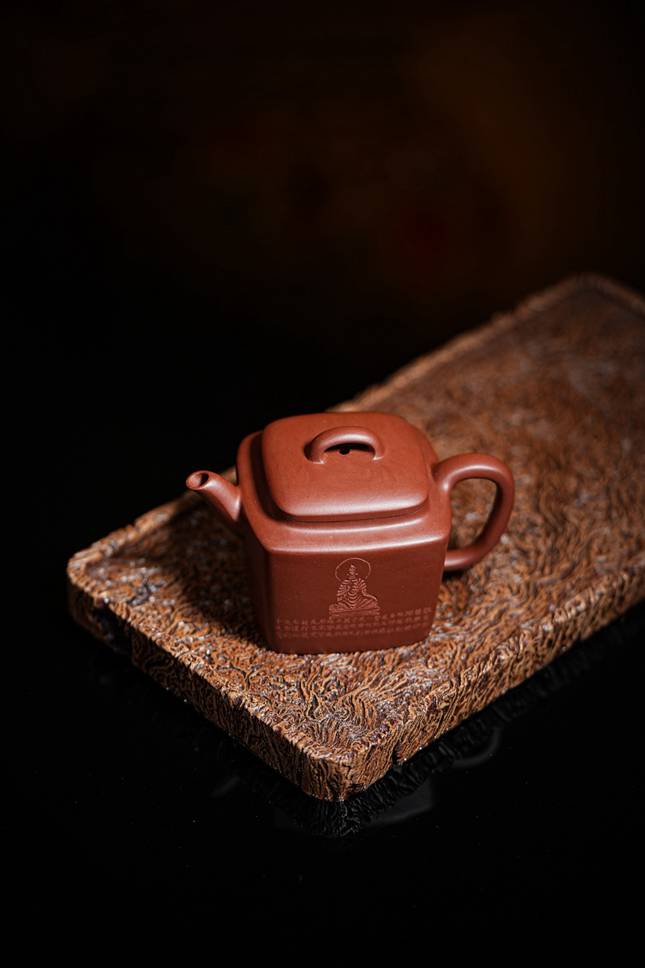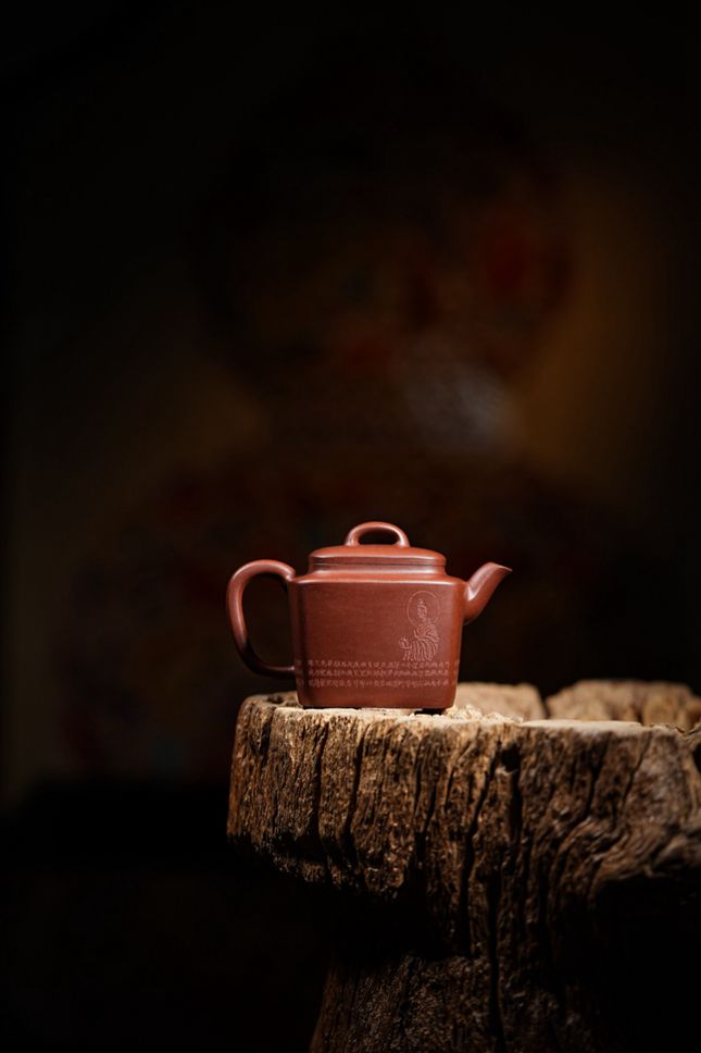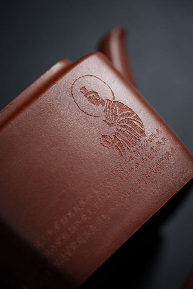 壶体刻绘尤为精妙:佛像庄严,衣袂翩然似有禅风拂过;《心经》经文笔触细腻,刻工深浅有度,空灵意境跃然壶上。无论是冲泡普洱、岩茶,借方器聚香之能令茶韵饱满;亦或闲暇摩挲,观刻绘而静心,皆成一场与传统文化对话的仪式。此壶不仅是实用茶器与艺术孤品,更承载着王涛老师的手作温度与收藏价值,为雅士生活添一缕禅思、一方清趣。