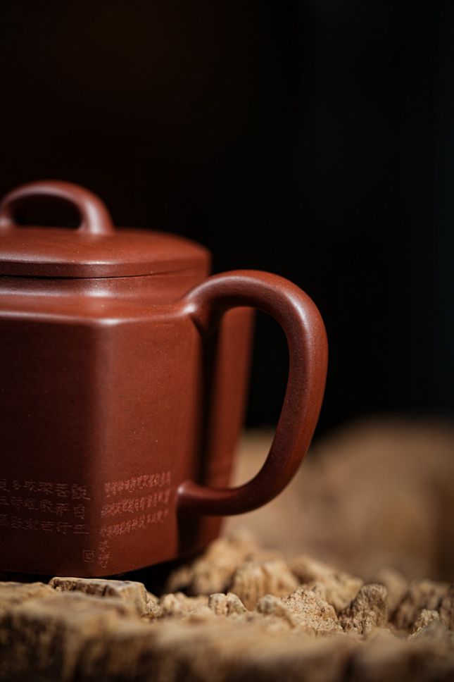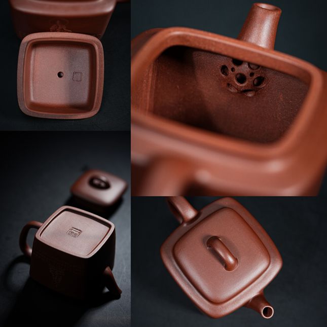 王涛老师以匠心手作的「高韵四方」紫砂壶,凝练紫砂方器的精工与禅意文化的深邃,在165cc的方寸之间尽显东方美学气韵。壶身取四方之型,线条挺拔如砥,四角周正而不失圆融,盖口密合严谨,桥钮简练,流把胥出自然,处处诠释“方中寓圆”的工艺精髓。底槽清泥料源自黄龙山原矿,泥色温润古朴,聚香锁味更显茶汤醇厚;经岁月养润,壶身渐泛如玉包浆,光泽含蓄,成为时光与茶意交融的印记。