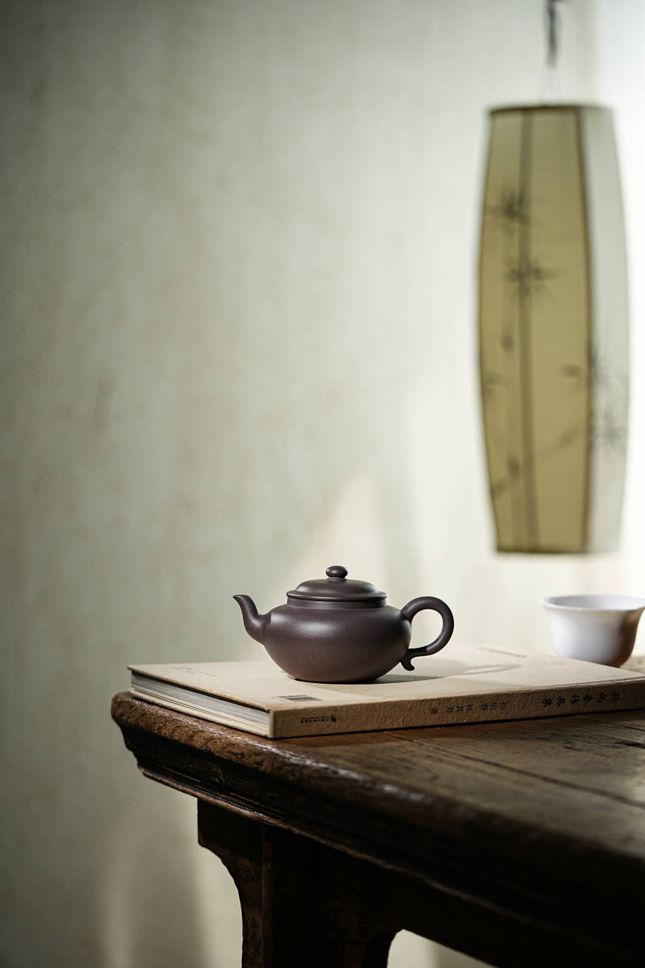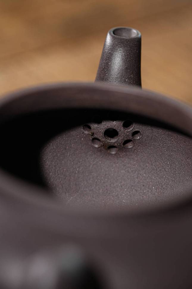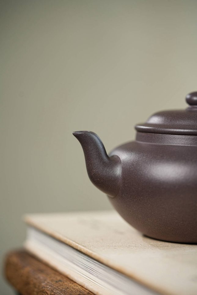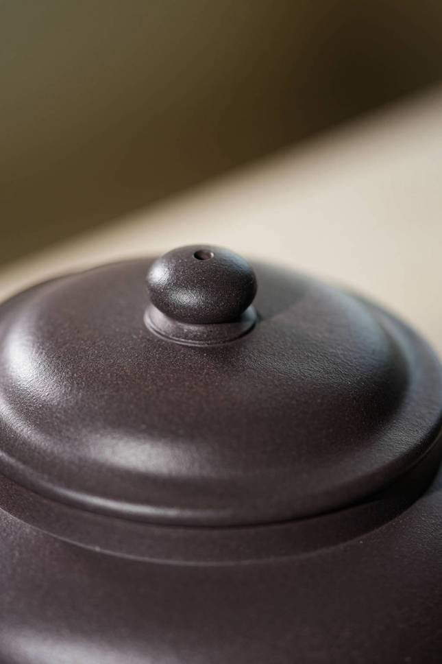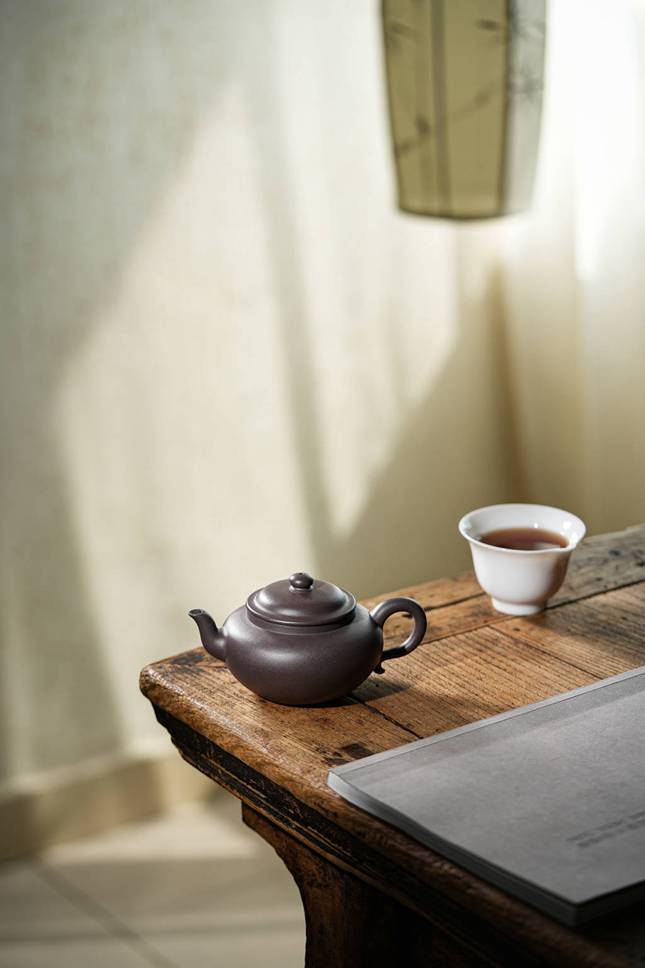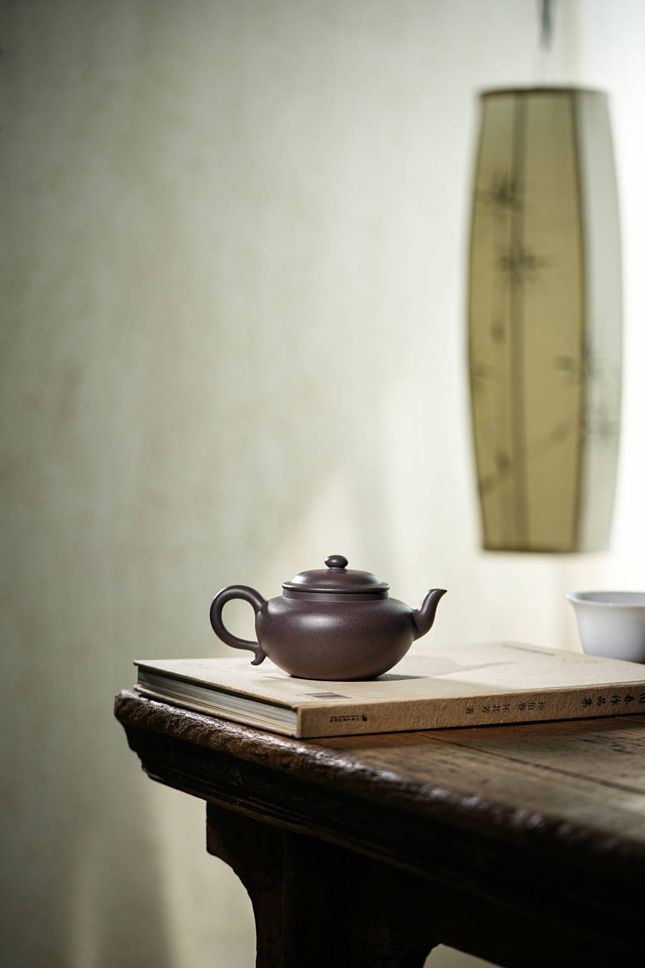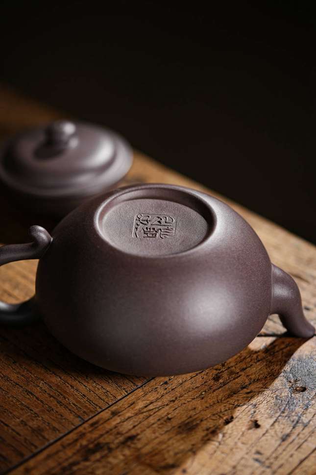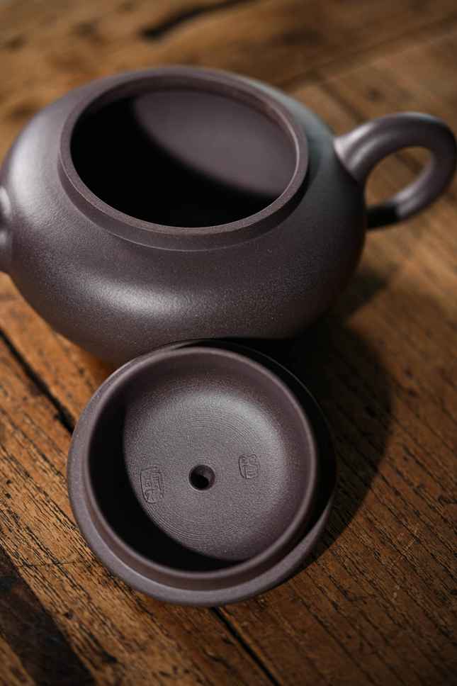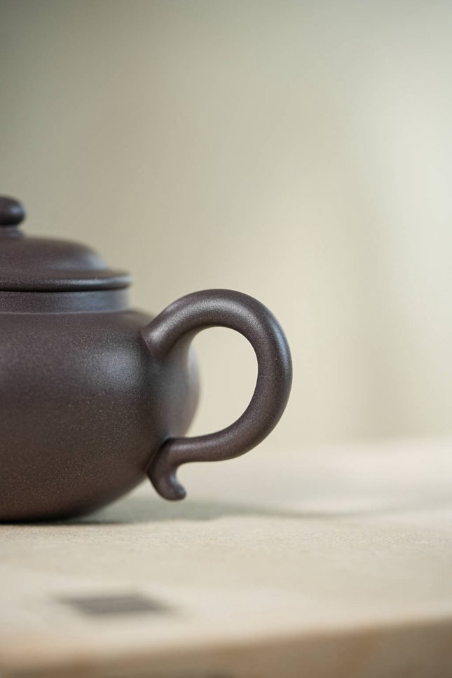 壶形以经典掇子为基础,经匠心改良,造型更显简洁大方。整器轮廓莹润饱满,气度浑朴典雅,仅以简练流畅的线条便勾勒出昂扬挺拔之姿,气韵非凡。壶身浑圆,腹部丰腴,呈上丰下敛之势,线条自壶肩向下自然收敛,挺拔中见俊逸。壶口宽敞,壶盖中部圆润隆起,展现丰满柔和之美,压盖工艺精湛,与壶口密合如一。
