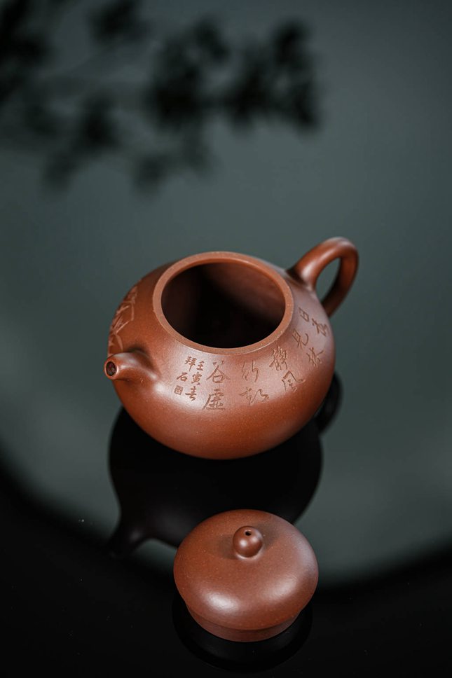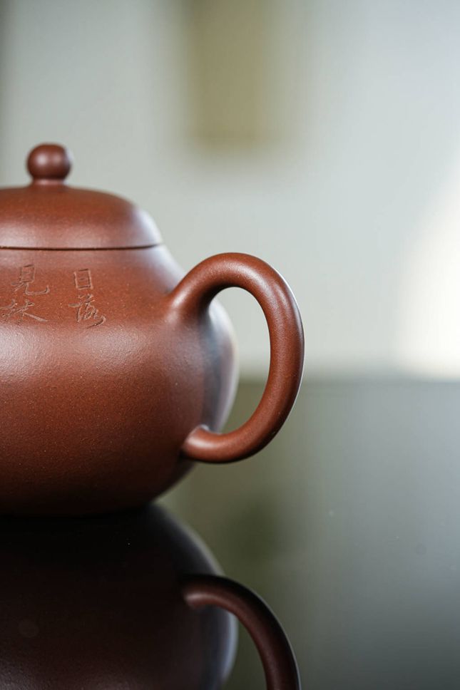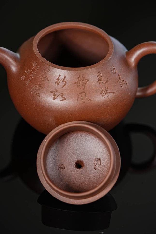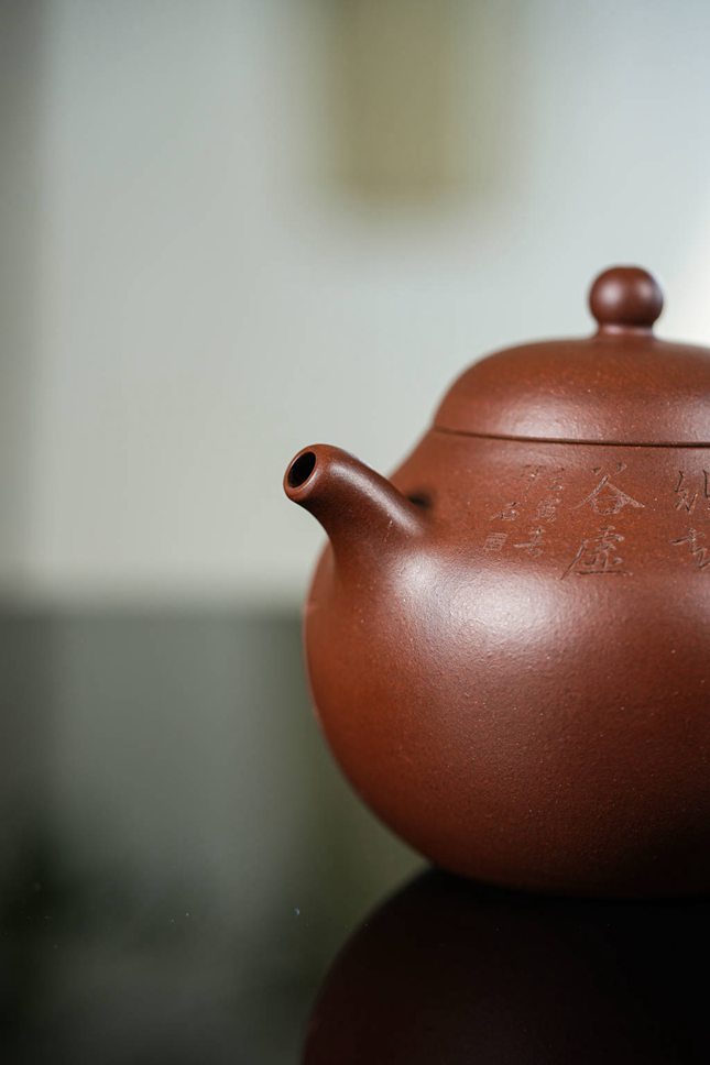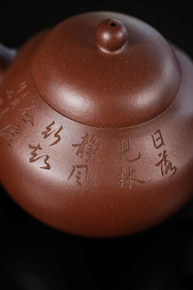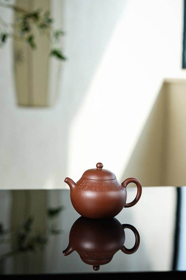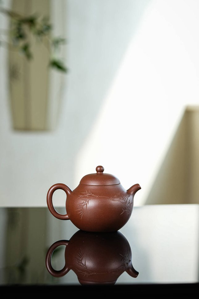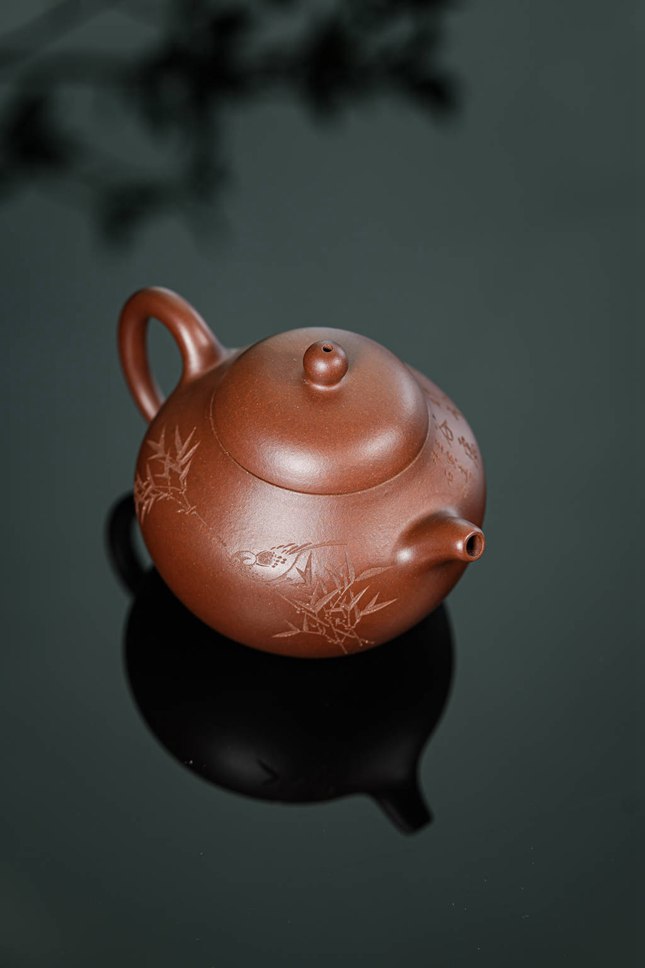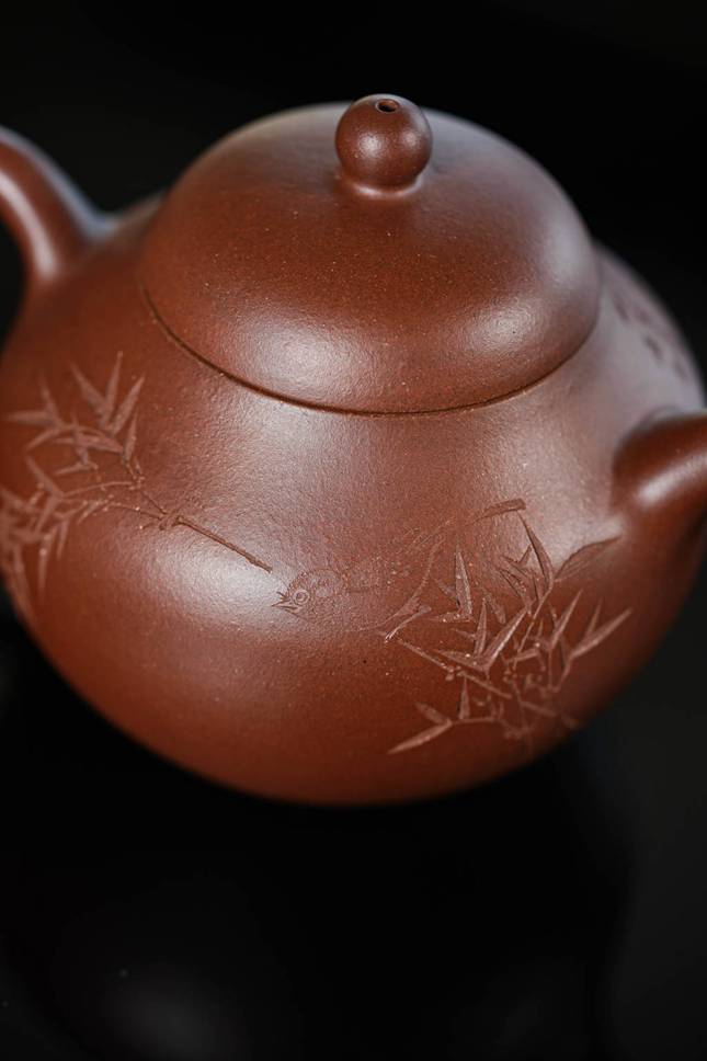 其造型仿梨而生,上敛下丰,轮廓简洁流畅,呈现出一种端庄沉稳的典雅气度。工艺上更是无可挑剔:截盖与壶口密合通转,浑然一体;隆起的壶盖之上,一枚精巧的梨蒂形壶钮画龙点睛;古拙的壶流确保出水爽利有力,而纤细的壶把则与整体和谐统一,执握感舒适妥帖。尤为夺目的是壶身的精工刻绘——一只喜鹊悠然驻足于竹枝之上,画面栩栩如生,刀法精湛老练。
