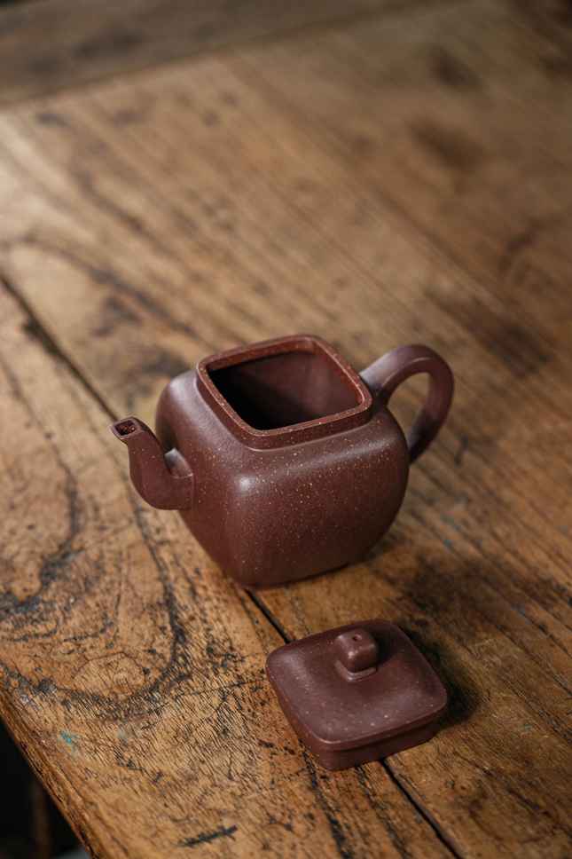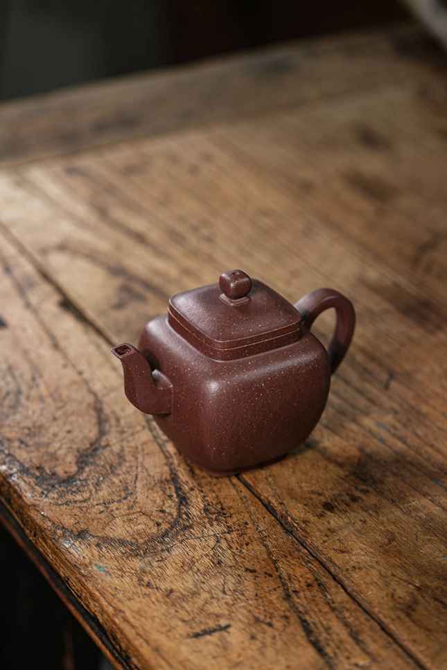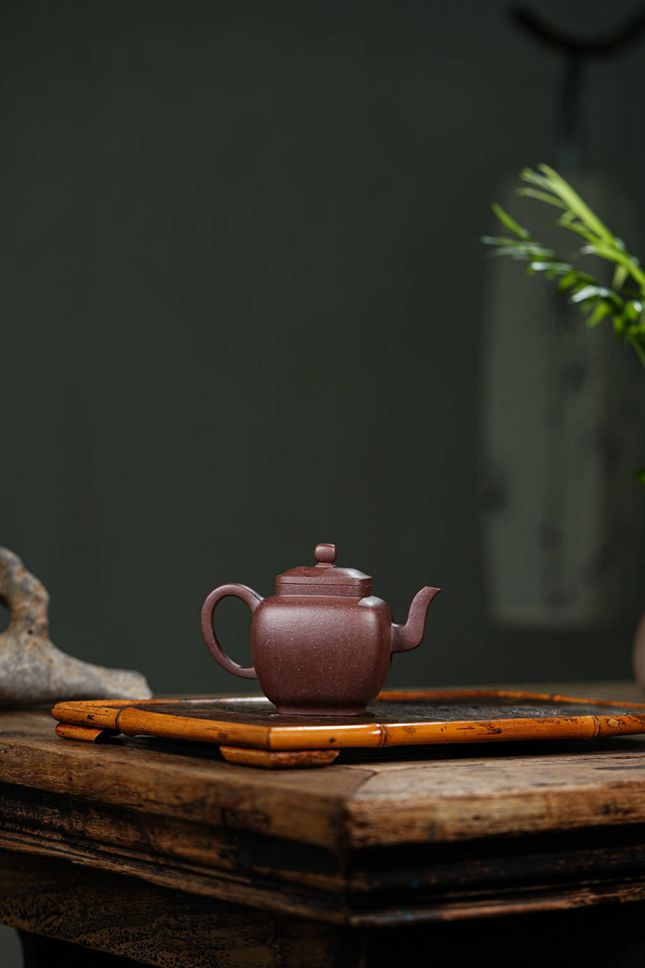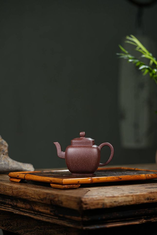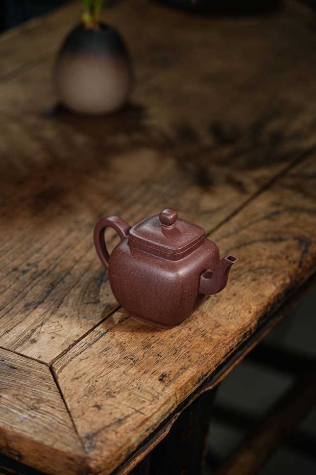 青年实力派陶艺家王涛,师承名家马璟辉,深得全手工传统技法之精髓。其作「高四方」壶,容量180CC,以优质紫泥抟制,乃仿清初大家陈鸣远代表作「鸣远四方」之神韵而创。此壶整体呈上阔下敛之方器格局,沉稳中透出灵动之气度。盖面饱满微鼓,子口处理精准,密合紧致,盖顶造型与壶身呼应,高挑的桥形钮卓然而立,宛若冠冕,成为视觉焦点,彰显不卑不亢之器宇。