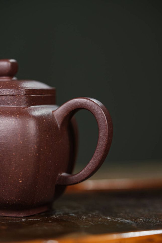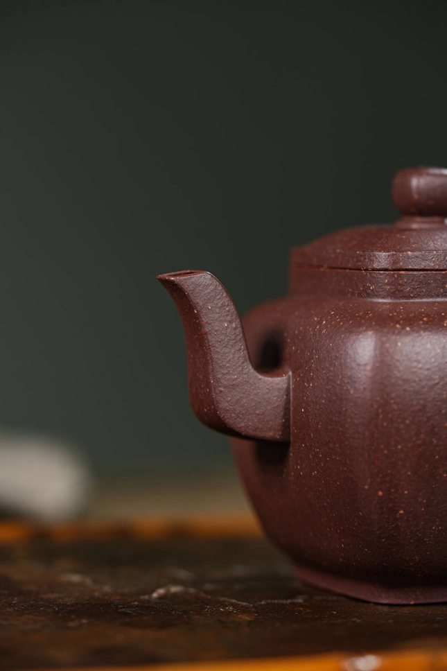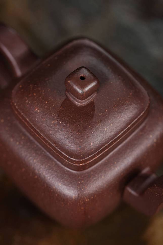 壶流设计为三弯式,曲线优雅且昂首向上,寓意积极;耳形壶把自肩部垂落,棱角清晰,线条流畅,与流形成巧妙平衡,取势大度。壶身主体方圆兼济,轮廓中正,布局严谨规整,展现出制壶者对方器线条比例的精准把控。壶底承袭原典,设以四方圈足,使全器更显挺拔端庄,线条曲直并蓄,立体感极强。通观此壶,紫泥胎质细腻温润,色泽红褐,在直线勾勒的刚健骨力与曲线流转的柔和韵味交织中,完美演绎了传统方器的平稳庄重与内在张力。王涛此作,不仅是对经典的致敬,更是其深厚功底与艺术感悟的集中体现,于方寸之间,可见乾坤气象。
