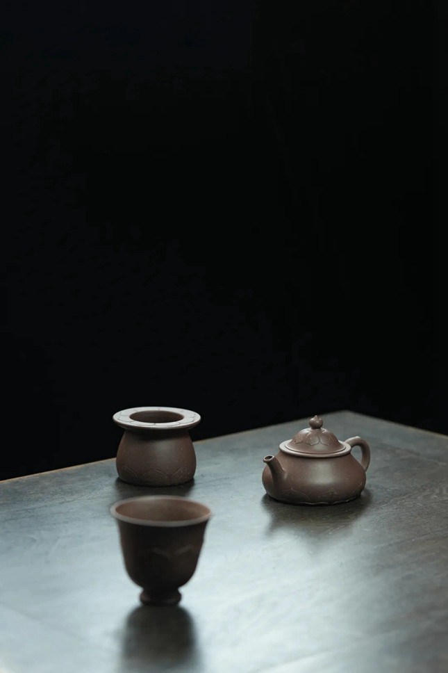 莲台象征清净圣洁,通过壶身下部塑莲花瓣使整体呈莲台状寓意高洁脱俗,是超越纷扰的禅定与智慧之所。万象是世间万物,代表的是纷繁复杂、变化无常的现实世界。莲台万象是“出世”与“入世”的圆融统一;“看取莲花净,应知不染心”意在不脱离现实世界而追求觉悟,在面对和了解所有现象的同时,保持内心的清净无染。通过塑器以展现紫砂器物由用入道、由茶悟禅的境界。