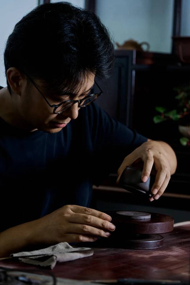 孙海,一九八六年生人。二00八年初识紫砂,随紫砂村老艺人董新华学习传统紫砂技艺。二0一三年随师父周洪彬潜心学习,深入实践紫砂工艺及造型创作,多有收获,并能在日后的创作中持之以恒,深学细悟,真信笃行。