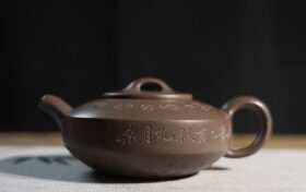 朱老师以原矿青灰泥手制此扁石壶,式承曼生遗韵,胎薄工精。壶身镌刻文人铭款,大拙若巧,于简练中见深意,既是实用利…