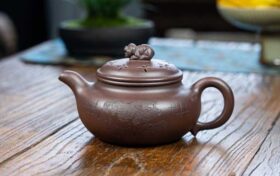 此壶以传统文旦器为基,上收下丰,紫泥温润。盖顶猿猴端坐望云,壶身松枝垂下、猿猴邀约,灵动古朴。融山野之趣与出世…