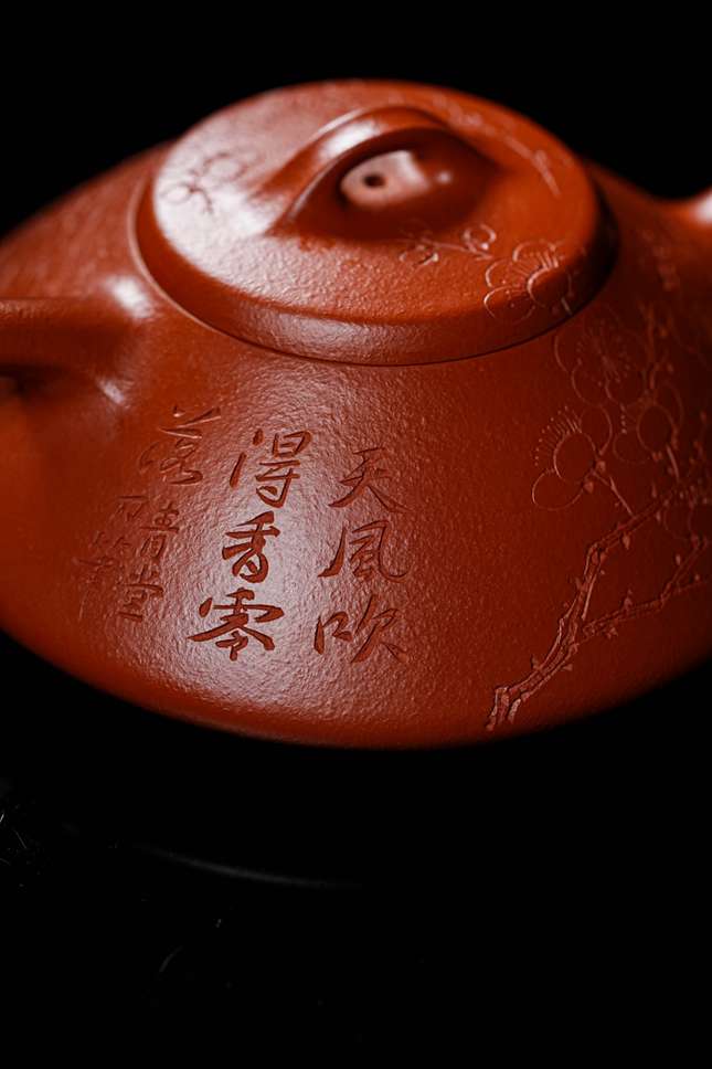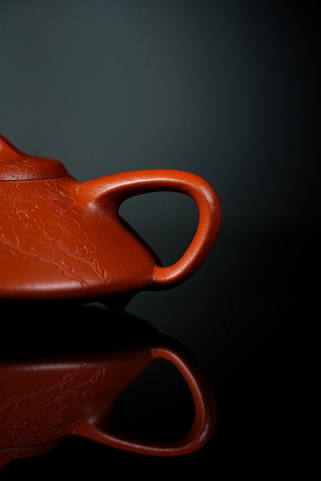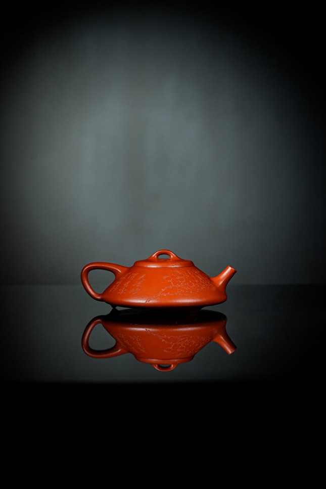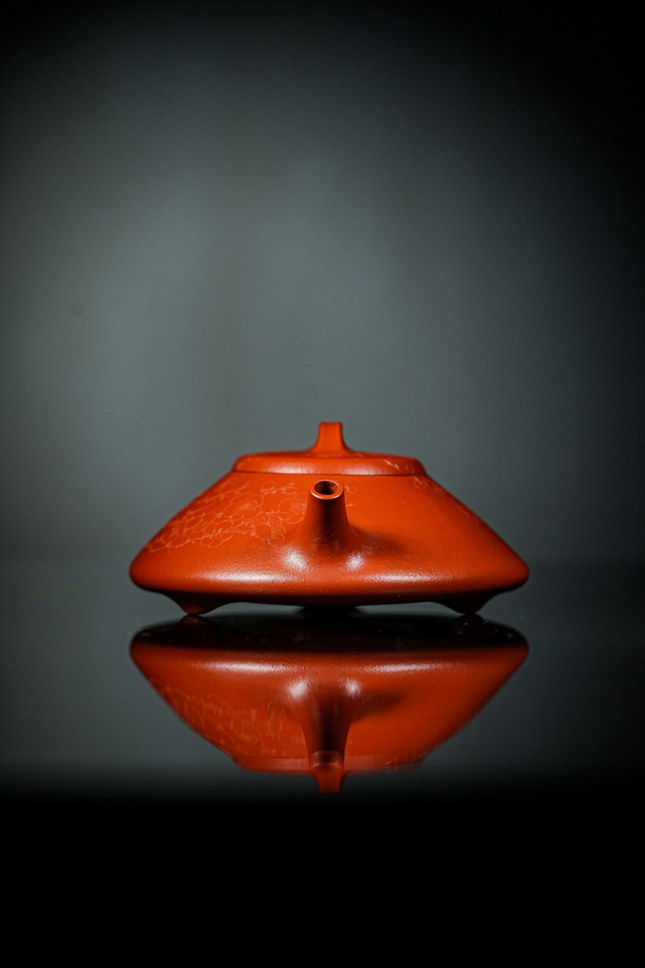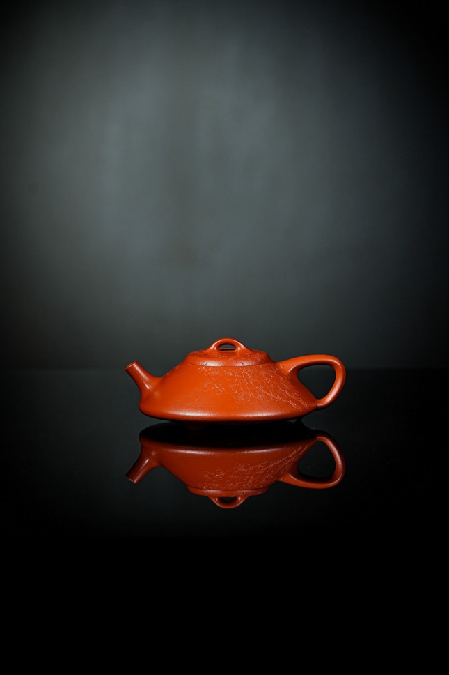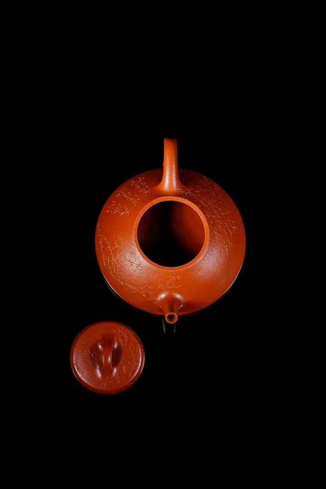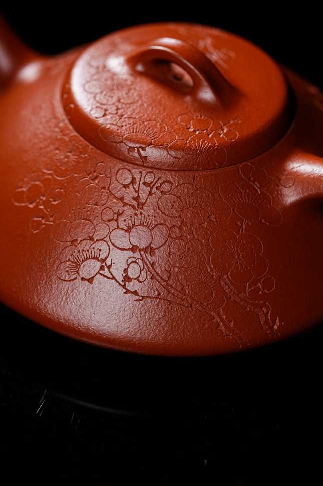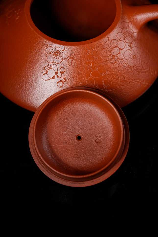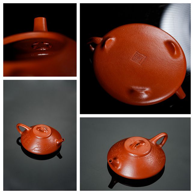 细节处尽显匠心:短小精悍的直流壶嘴,出水爽利果断;环形壶把比例精准,弧度贴合掌心,端握十分称手;微鼓的盖面上,一枚圆润小巧的壶钮轻置其间,与整体形制相映成趣。此壶既是实用的茶器,亦是可赏的雅玩,在日常泡养的摩挲之间,朱泥将渐生温润包浆,色泽愈发红润莹亮,神采内蕴。张春兴此作,承袭“马家军”一脉精湛技艺,于传统中注入当代审美意趣,是一件兼具实用雅趣与收藏价值的茶席珍品,值得每一位爱茶人细细品味。