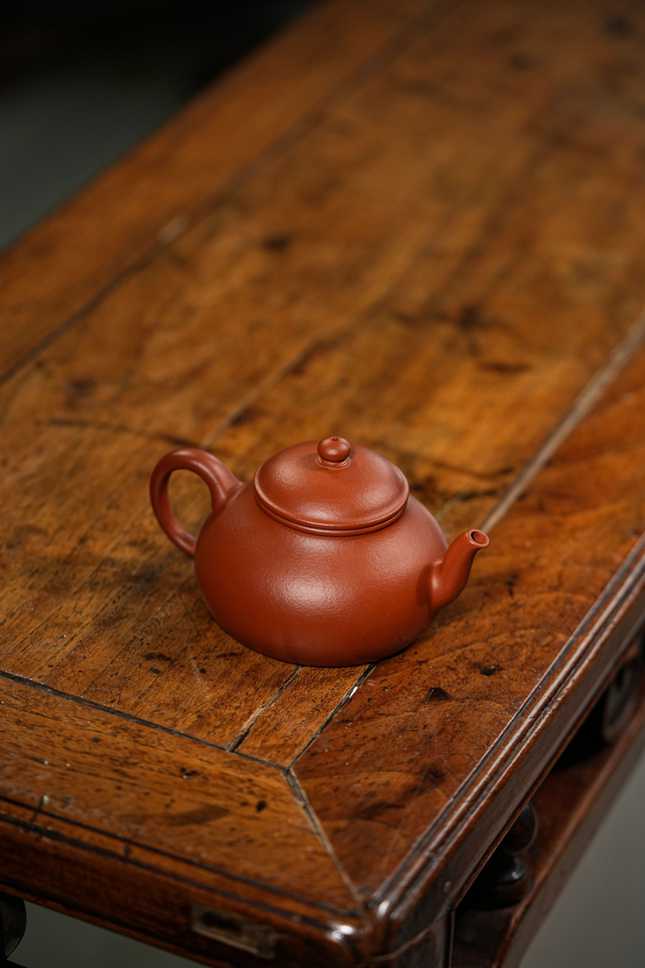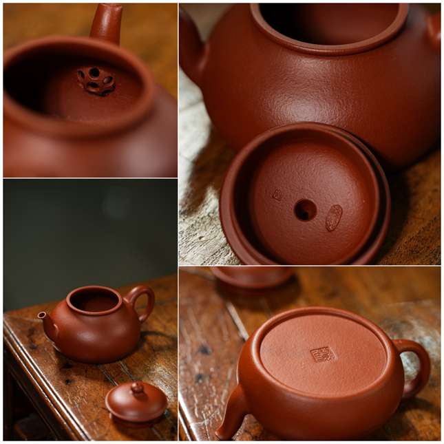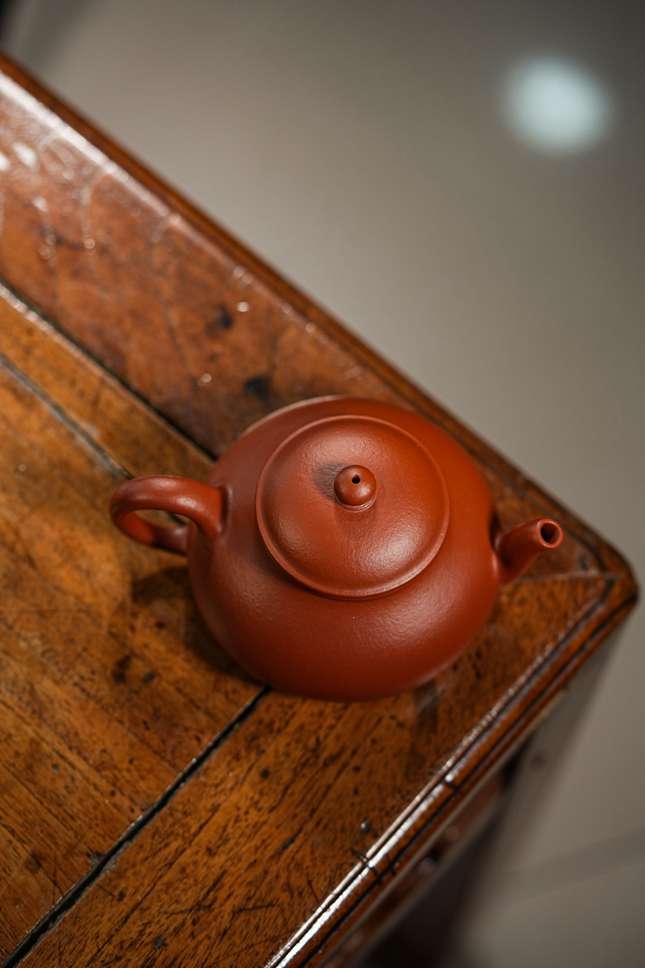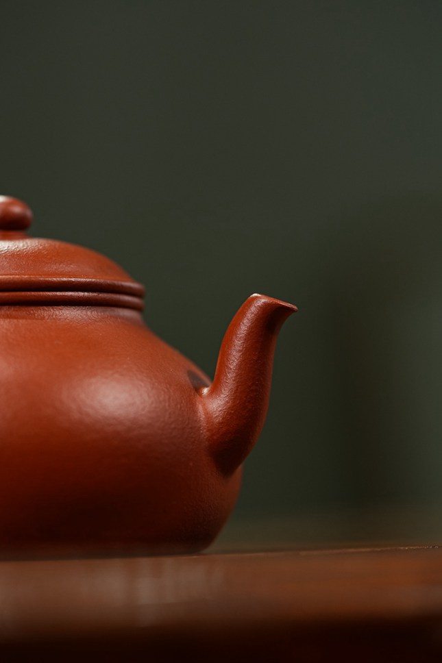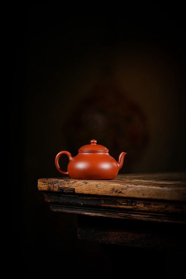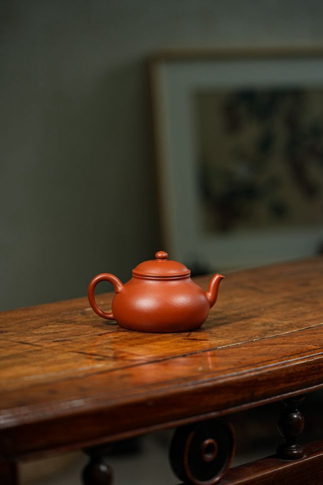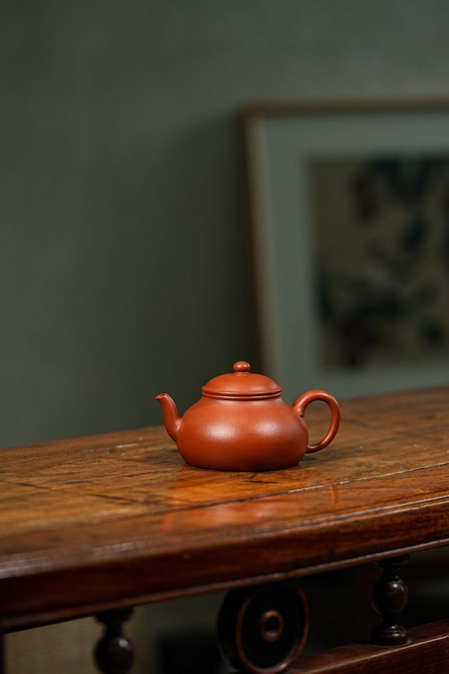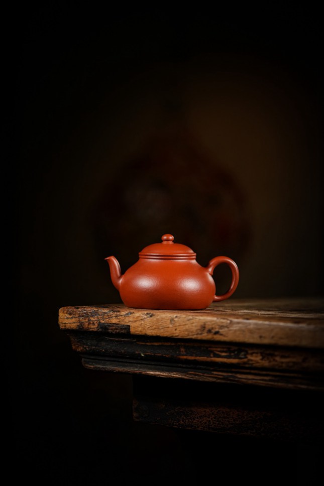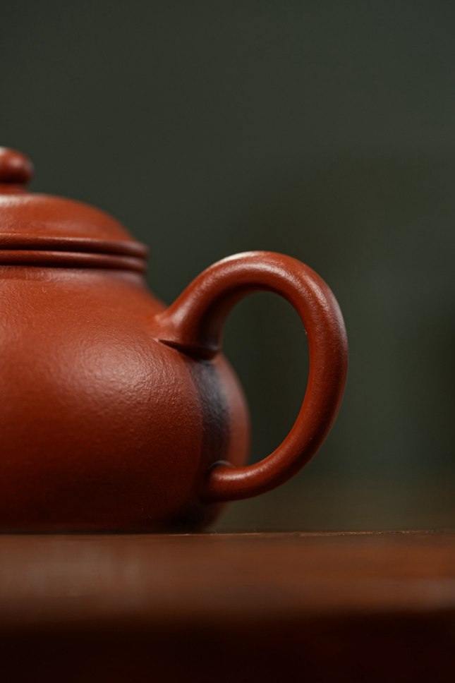 当实力派陶艺家孙超取上乘朱泥,抟塑这把160cc的「香缘」壶时,他便在传统与创新的交汇处,为茶事注入了鲜活的灵魂。壶身圆融饱满,似纳乾坤清气;质若朱砂浸月,抚之如云缎温润。微穹壶盖似笠,俏立圆钮如晨星垂落,平添几分灵动。