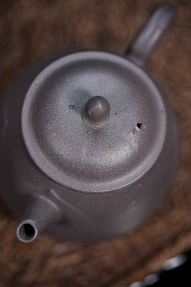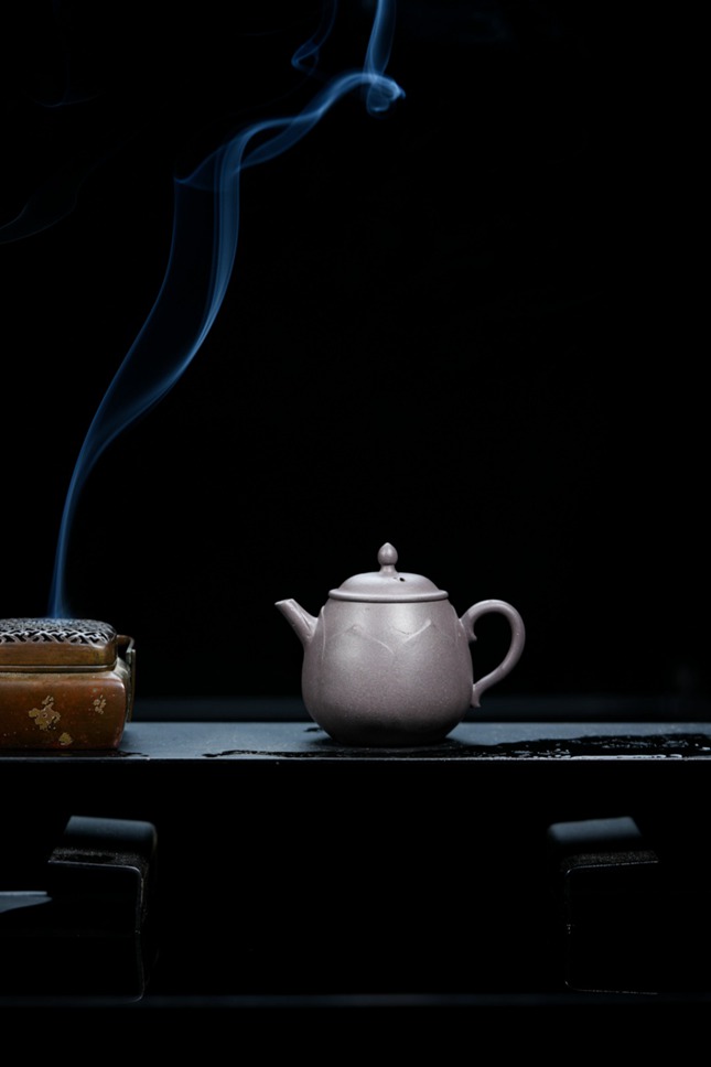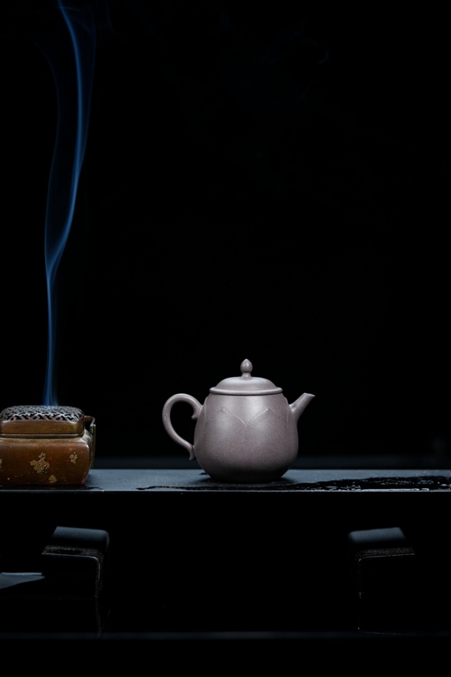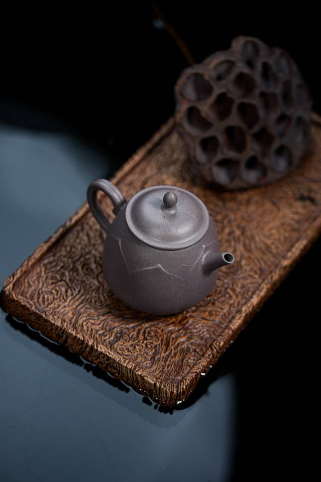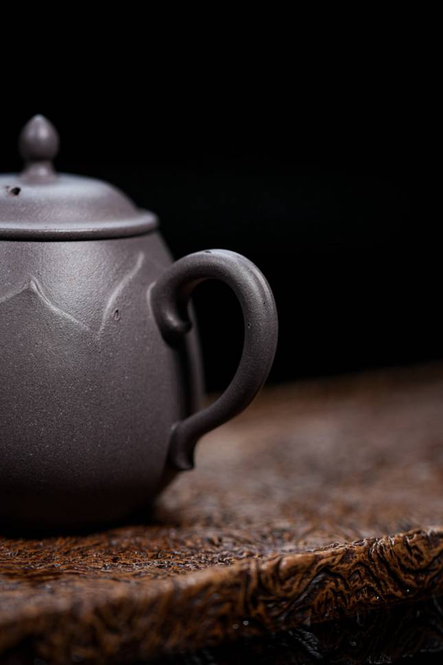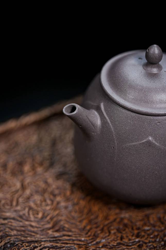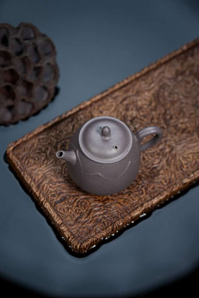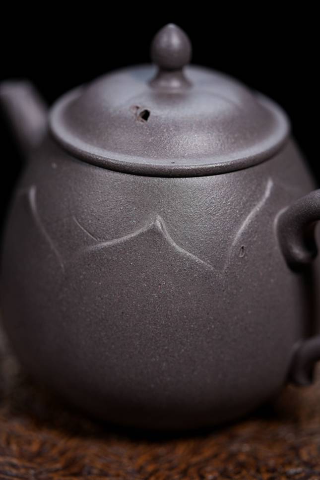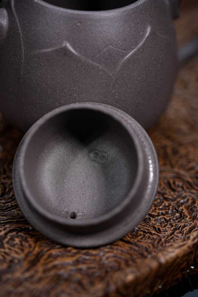 当秋日的疏朗与紫砂的温厚相遇,便成就了董俊峰老师这把“秋籁”壶的独特气韵。壶以珍稀青灰泥为骨,泥质细腻如秋霜凝野,上手温润,抚之生情。壶身隐刻的纹理,似远山叠嶂,又如莲瓣轻舒,在光与影的交织中,静静流淌着古雅与禅意——那是匠人以刀代笔,将秋天的空灵与静谧,深深镌刻进了紫砂的魂髓。