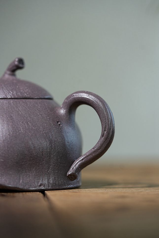 董俊峰以全手工仿生工艺,将自然意趣凝练于壶体:壶钮似嫩茎轻翘,壶把如枝蔓婉转,壶底微敛若莲瓣初拢,每一处线条皆由匠人徒手拿捏,灵动中蕴藏「天人合一」的造物哲思。壶盖与壶身严丝合缝,出水孔排布精妙,断水利落无声,于细节处尽显工艺至臻。