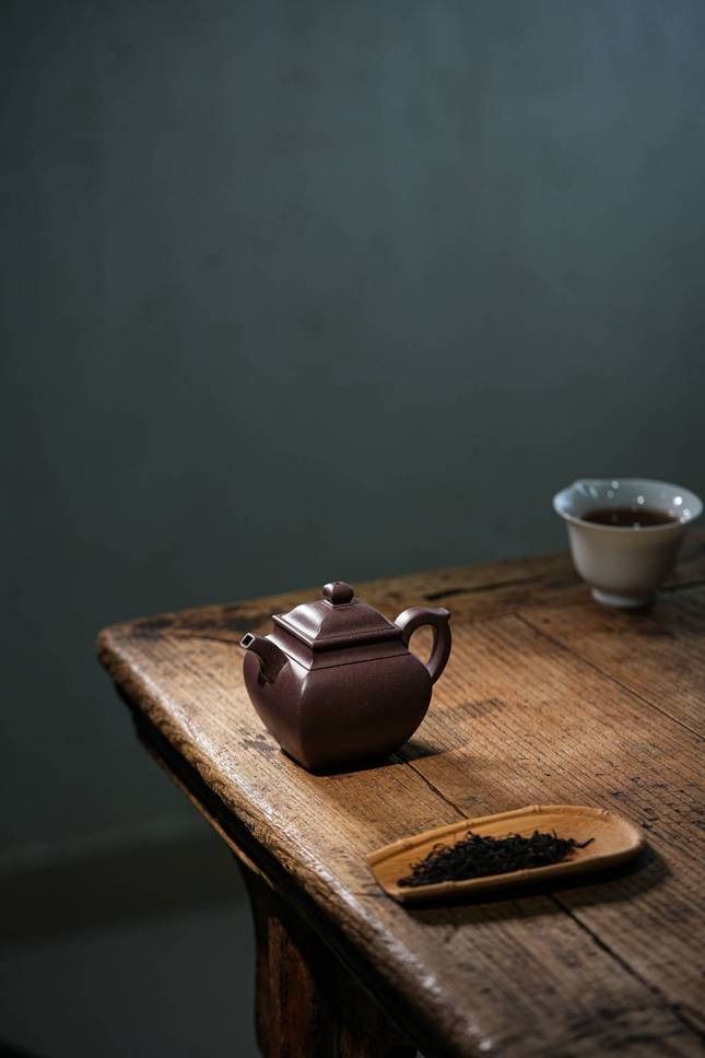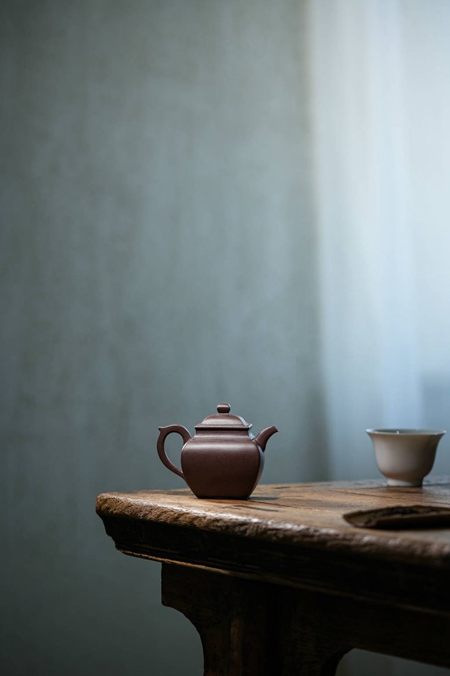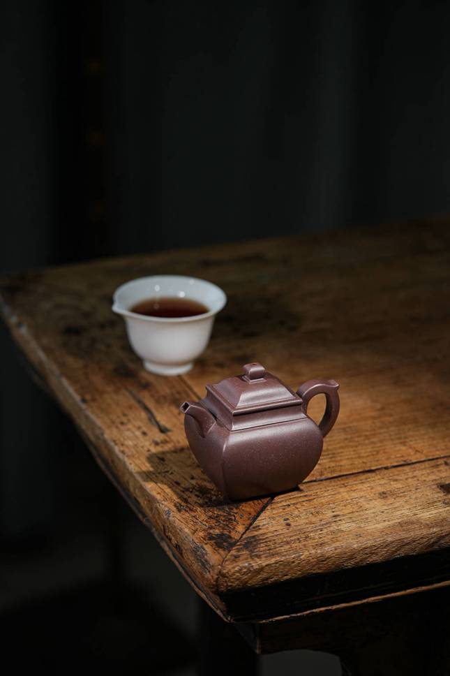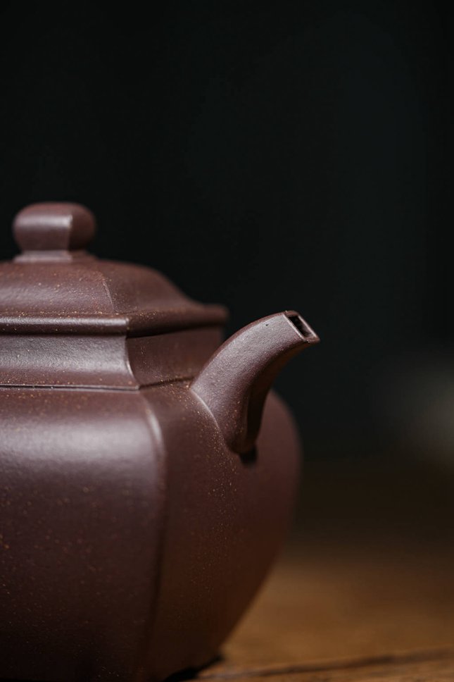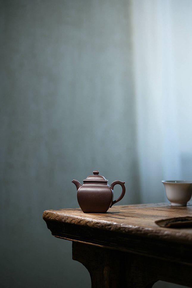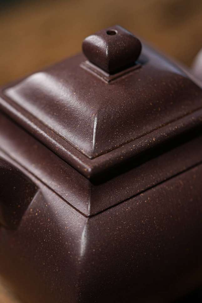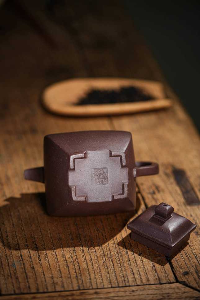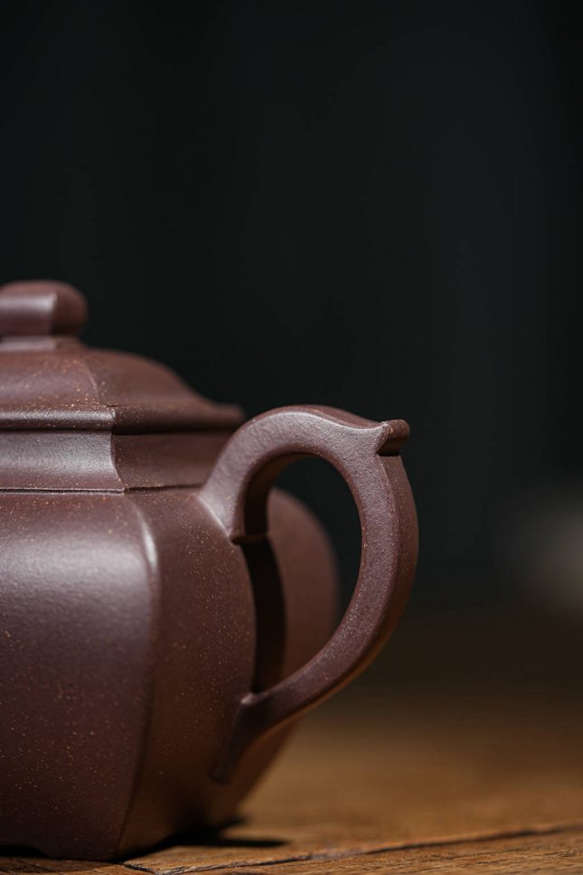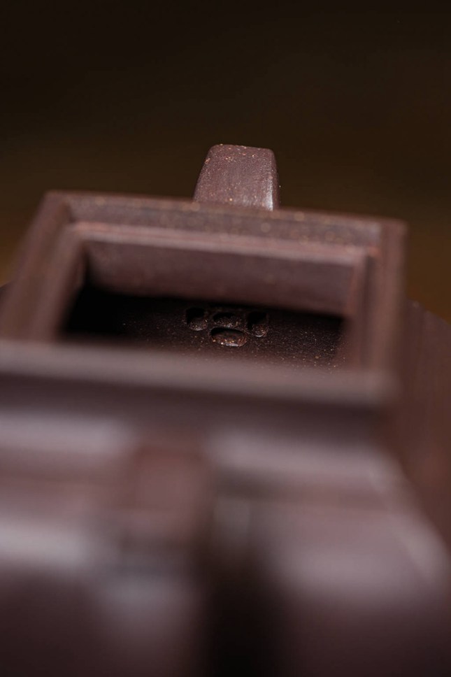最具匠心之处在于各部构件的和谐统一:弯流胥出自然,线条流畅;飞檐环把于圆润中暗藏方意,执握舒适。整器在视觉上方圆互寓,于稳重端庄中透出圆融豁达之气,既见端方古拙之韵,又具温文尔雅之美。汤玮老师通过「方炉」不仅展现了对紫砂造型语言的深刻理解,更传递了中国传统文化中“外圆内方”的处世哲学,是一件值得品鉴与珍藏的文人紫砂佳作。