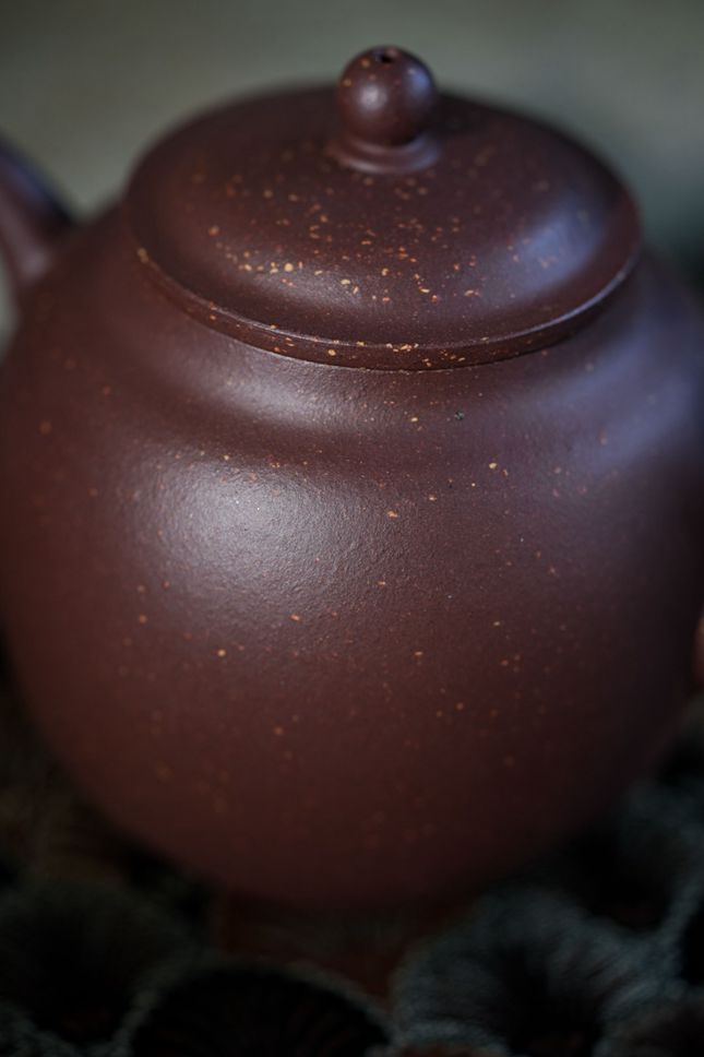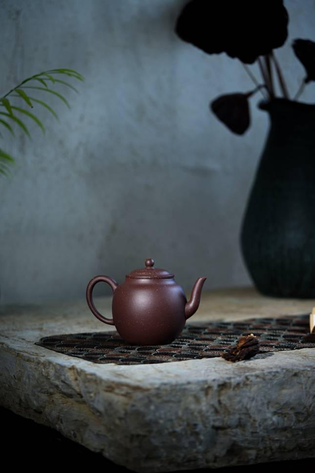 整壶气韵卓然,壶身饱满圆润,线条自壶钮至底足一气呵成,流畅自如,勾勒出敦厚稳重又不失挺拔之姿,文雅气质油然而生。细细品鉴,其工艺之精湛处处可见:盖面微微凸起,严丝合缝地嵌入壶口,与向外翻展的唇边形成巧妙呼应,不仅密封性佳,更在视觉上富有层次变化;壶嘴以直流式昂然伸出,如一股清泉即将倾泻,器宇轩昂;与之平衡的圈把厚实有力,端握舒适,彰显实用美学。