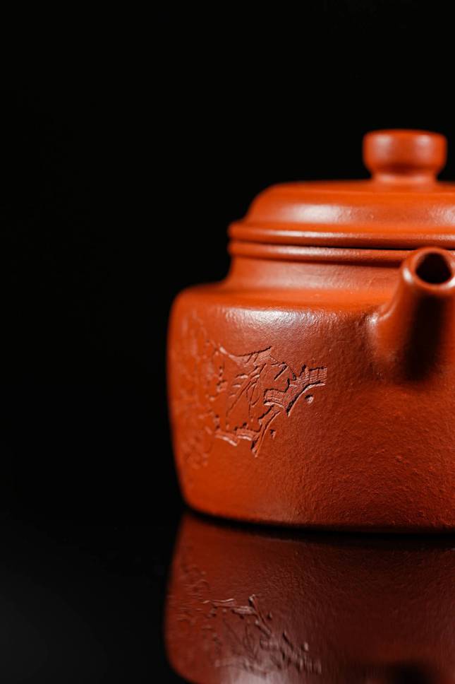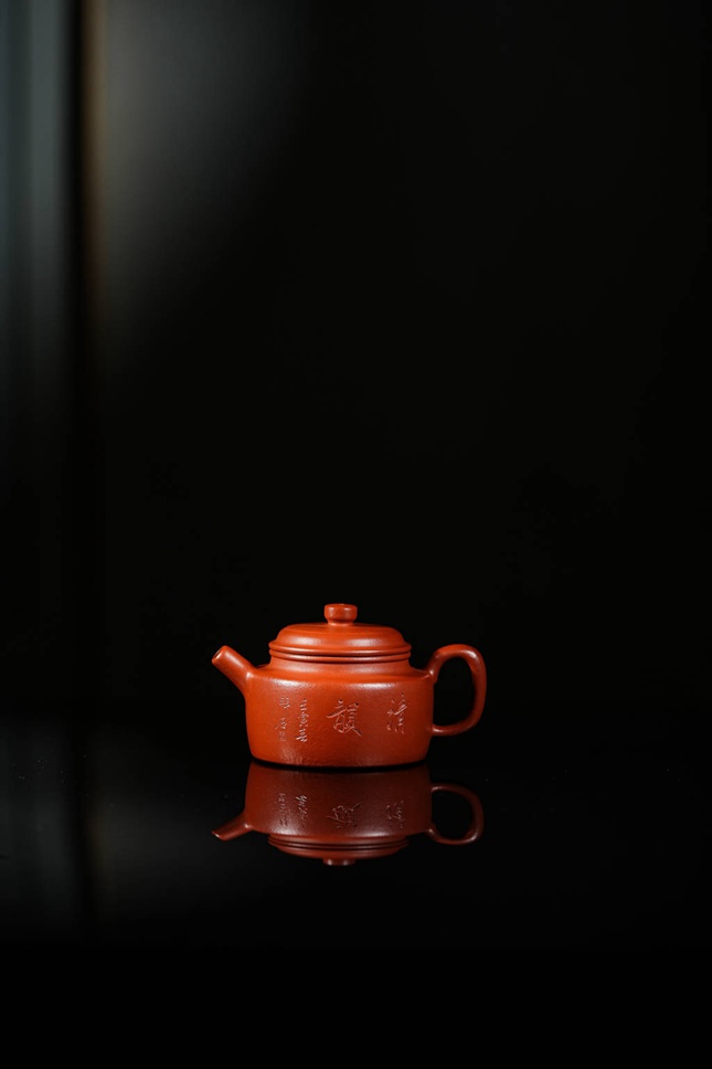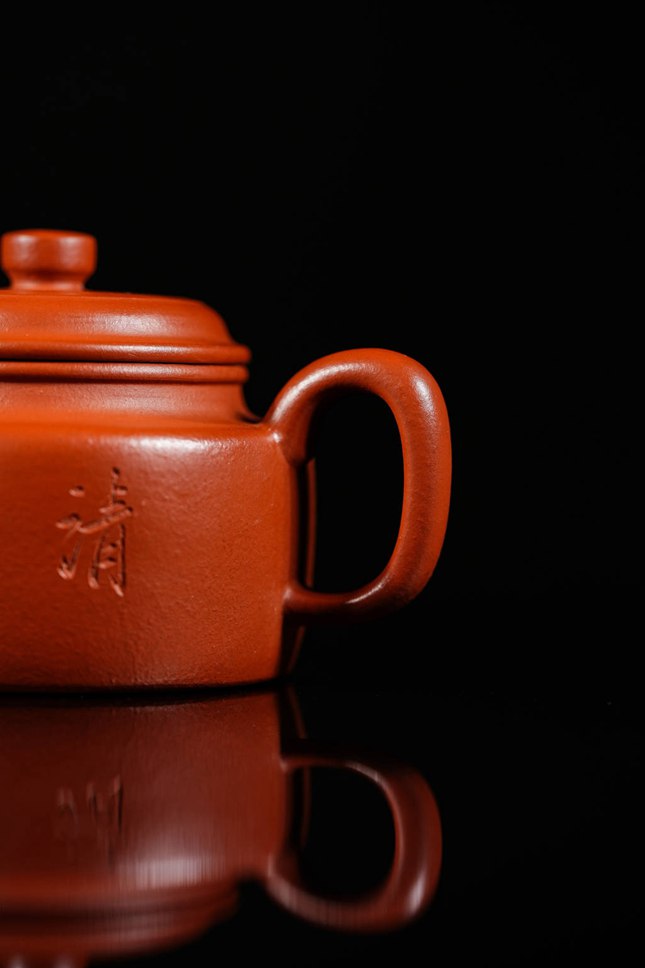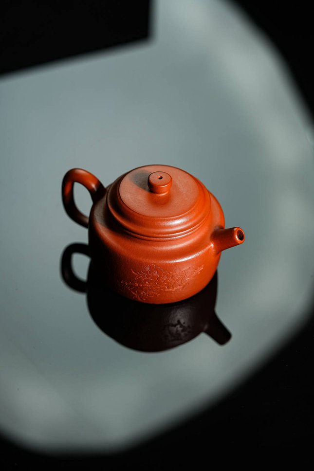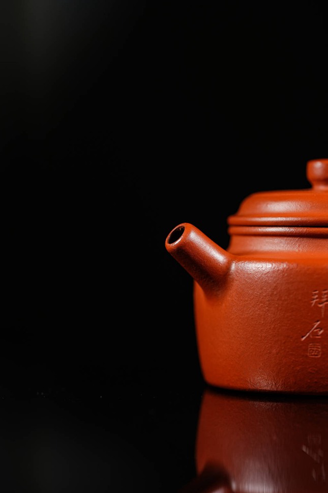 张涵涛老师手制的这款朱泥德钟壶,以125cc的玲珑体量凝聚紫砂艺术的精髓。此壶型源自经典德钟制式,顾景舟先生在《宜兴紫砂珍赏》中曾以“德清俭素,儒雅中和”诠释其精神内核。