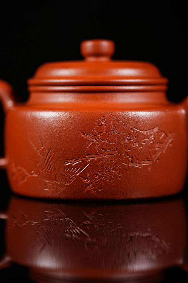 壶身刻绘更堪称点睛之笔——梅枝以刀代笔勾勒出铁画银钩,喜鹊依偎枝头,青灰羽翅与乌梅干枝相映成趣,早梅绽蕊的细节处理令“喜上眉梢”的吉祥寓意跃然壶上。这件作品既承袭了德钟壶清正直谏的君子风骨,又通过花鸟刻绘注入生机盎然的艺术情感,在方寸之间完美演绎了紫砂器物的文心匠意。