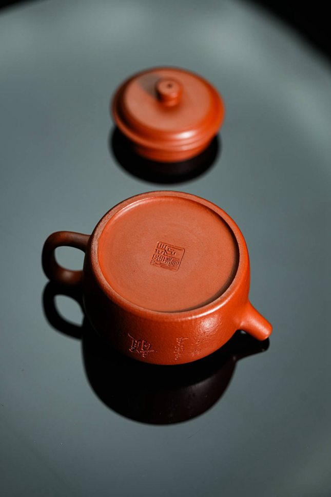 壶身取原矿朱泥为胎,泥色温润如霞,造型端方稳重,各部比例精准契合君子中庸之道:平盖钮与壶身形成和谐共鸣,直流嘴与耳形鋬构成昂扬气韵,壶肩圆转的过渡线条如行云流水,既见筋骨又显丰腴。尤为精妙的是盖沿那道细线装饰,以毫米级的精准把控展现制壶功力,与壶口双唇般的圆线呼应,成就了整器静穆端庄的气度。