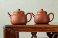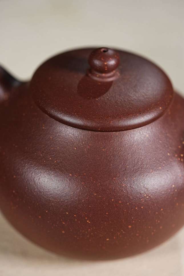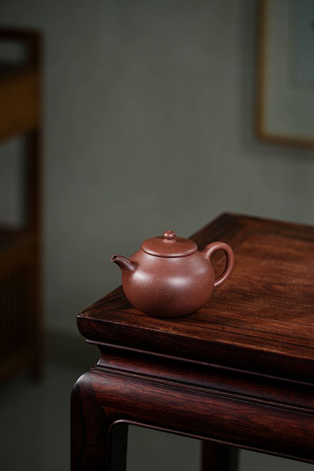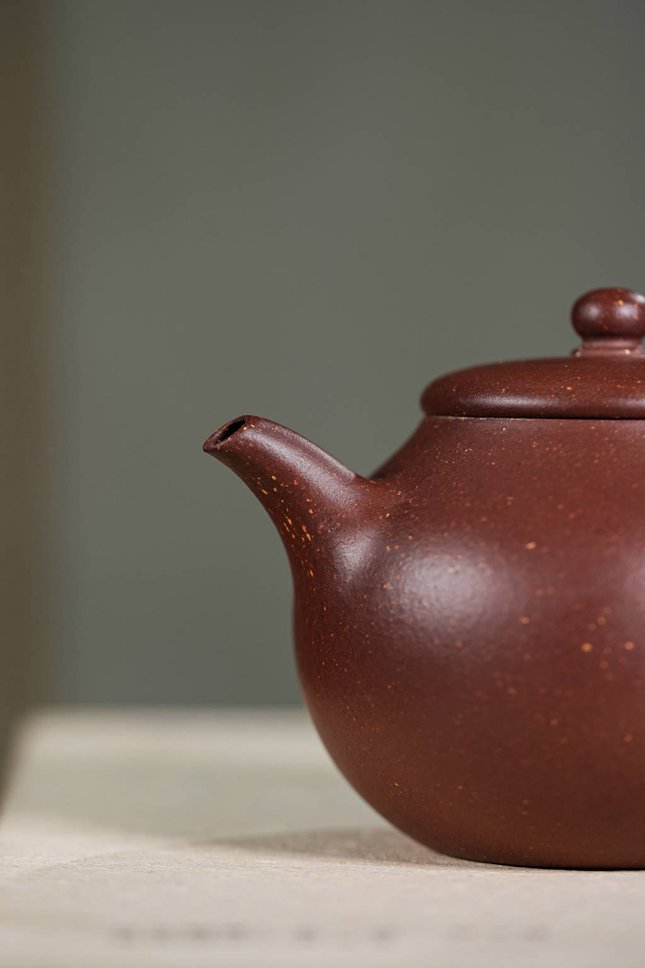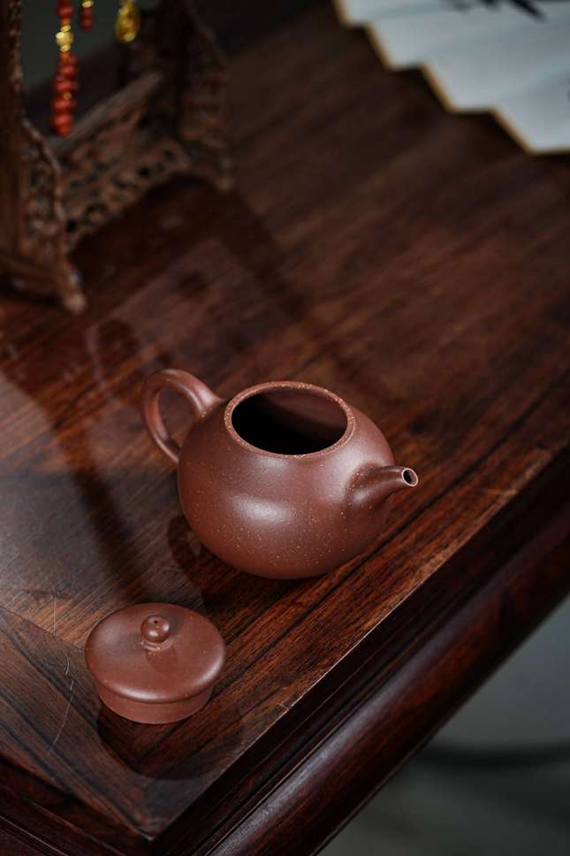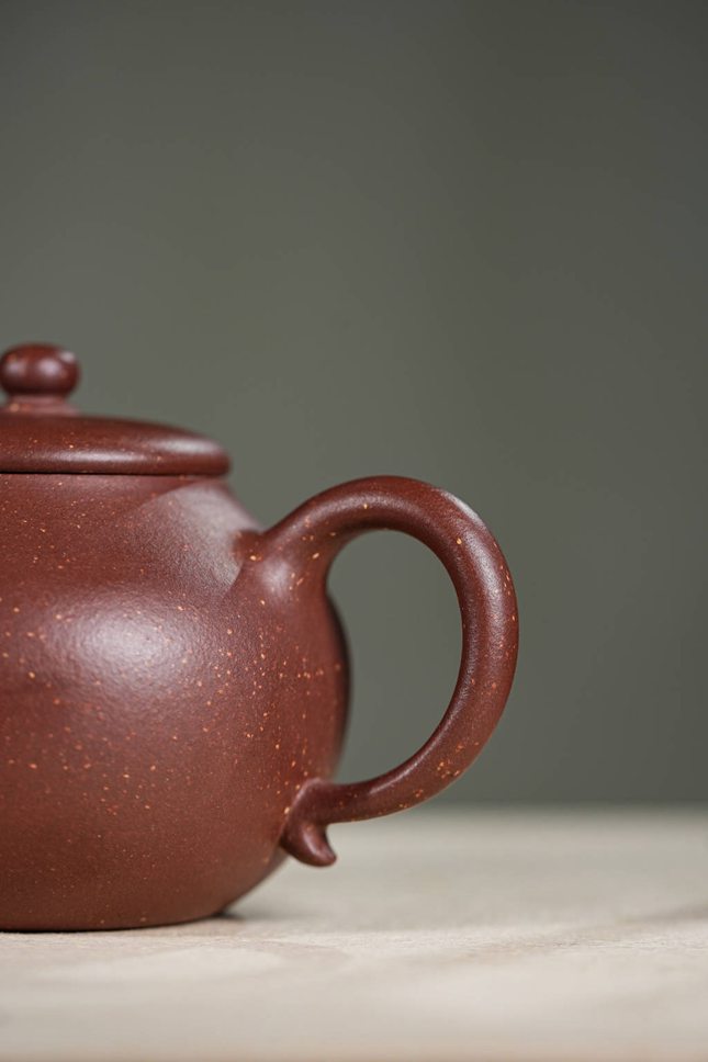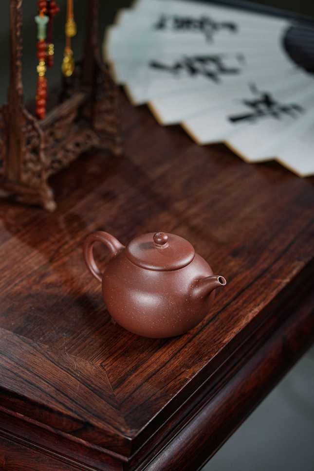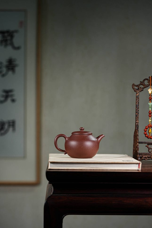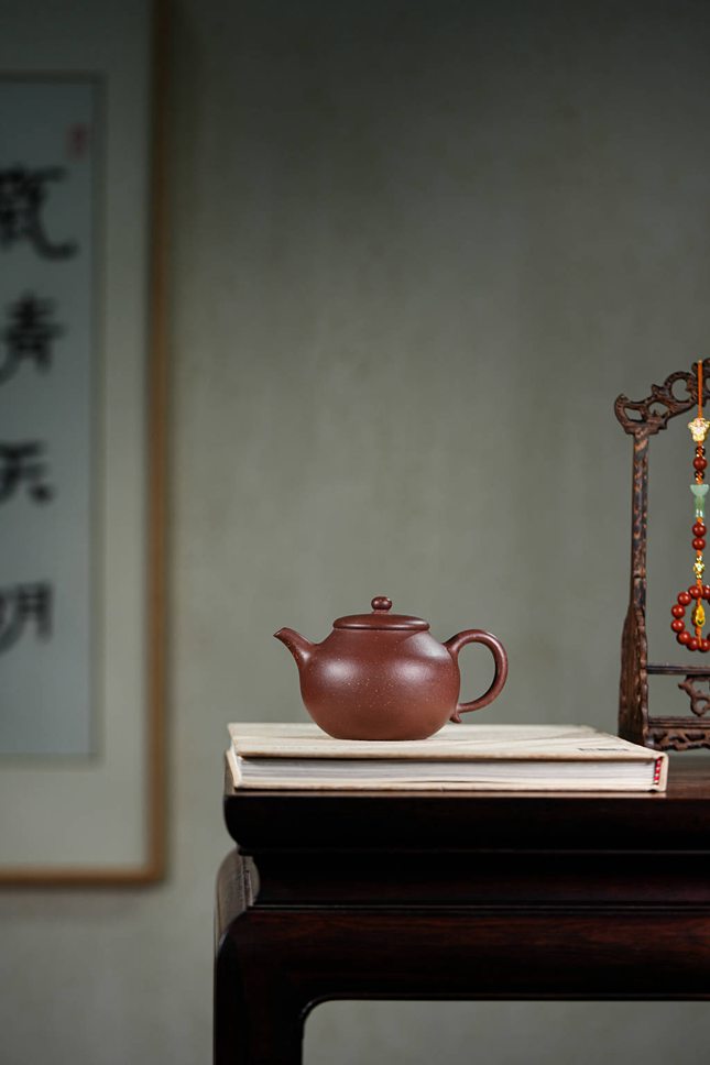 观其造型,壶身似橄榄,饱满而富有张力,配合流畅舒展的“美人肩”与颀长秀拔的壶颈,古韵盎然。细节处尤见功力:壶把下端缀以精巧垂耳,宛若古典佳人耳畔摇曳的珠饰;压盖微微隆起,一粒圆珠钮自然耸立,如秋水之上凝结的露珠;子母线采用外翻设计,咬合紧密如天工,贯通壶身的每一根线条皆柔美纤巧,于典雅稳重中透出灵动的韵味。整器亭亭而立,毫无赘饰,却在简约中蕴藏着深厚的传统功底与文人意趣,散发出一种清傲脱俗、冷静从容的精神气度,令人在使用与赏玩之间,品读一份穿越时空的宁静与深远。