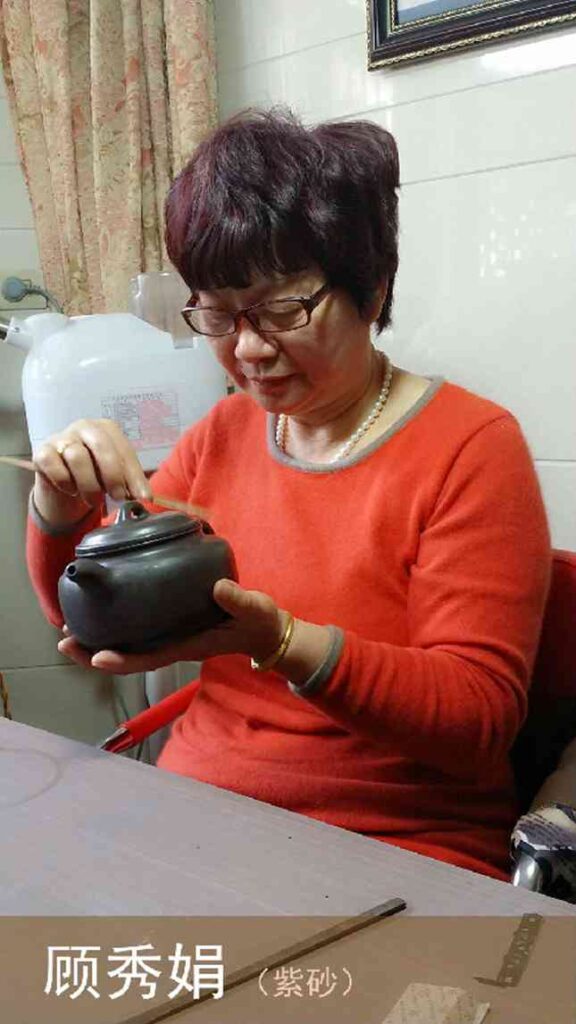从业四十多年来,在一代宗师、紫砂泰斗、 中国著名工艺美术大师顾景舟(伯公)及顾陆洲(公爹)的言传身教下,所制紫砂陶器光润圆正,线条清晰圆醇,寓意丰富深刻。顾秀娟壶艺坊经常受海内外诸多媒体(港、澳、台、日本、新加坡、中央、北京、上海、江苏等电视台、广播电台、报刊、杂志)的采访,录制紫砂专题片等。 国家领导人荣毅仁、李铁映、费孝通、李德生、吴阶平、王文元、彭佩云、江渭清、汪道涵等,各界名人尹瘦石、钱君匋、吴冠中、尹安石、刘紫刚、邓亚萍、孙晋芳、火风、巩汉林、李文启、李琦、彭江等多次做客壶艺坊视察、访问、关心指导,并留下许多墨宝。