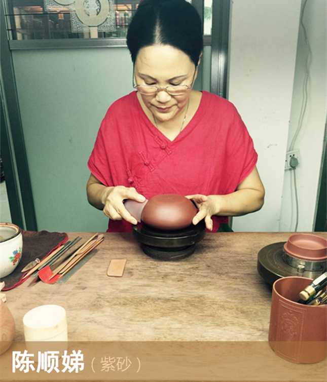 陈顺娣,艺名陈晔。1965年出生于陶都宜兴丁蜀镇,从艺三十余载,天资聪颖,能博众之所长,经多位名师指点,积累了丰富的紫砂壶艺创作经验。九十年代初创立“宝鑫源陶艺馆”,以推广经典紫砂文化为己任,秉承艺术生活化为宗旨,其作品深受广大紫砂收藏爱好人士的喜爱。2012年,作品《蝶恋花》荣获“第十四届中国(国家级)工艺美术大师精品博览会”金奖;2013年,作品《龙行天下》《汉韵》荣获“第十五届中国(国家级)工艺美术大师精品博览会”金奖;2014年,作品《清风竹韵》荣获“第十六届中国(国家级)工艺美术大师精品博览会”金奖;2015年,作品《渔翁壶》荣获“北京第三十一届国际礼品及工艺品展览会”工艺美术金奖。
