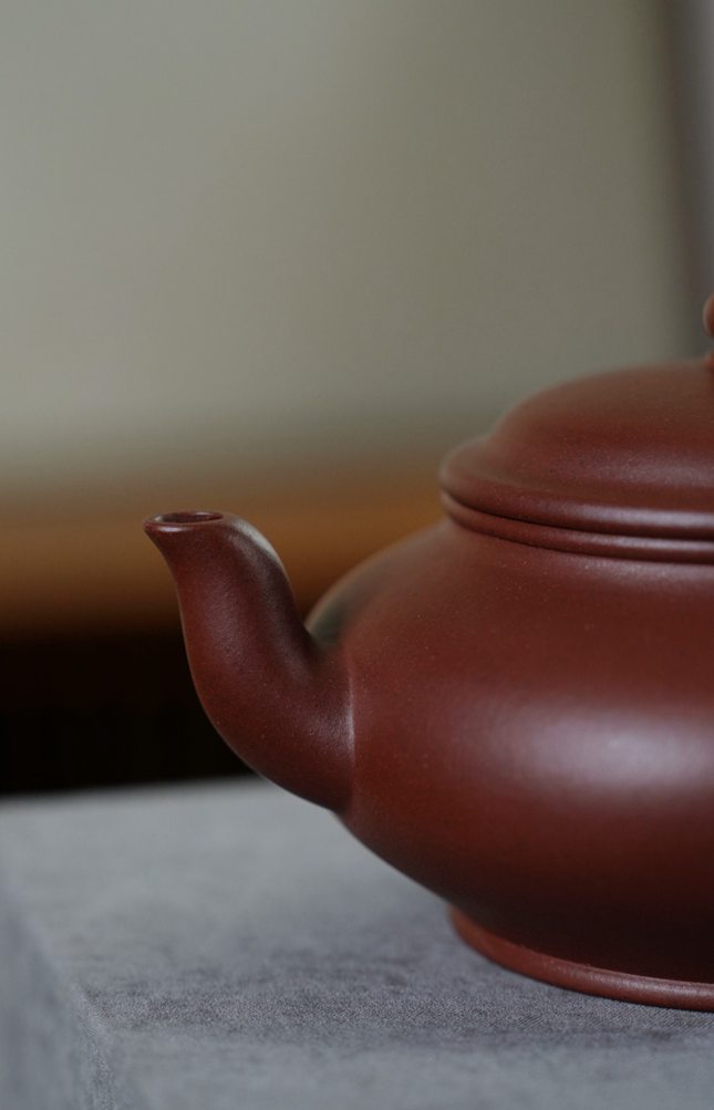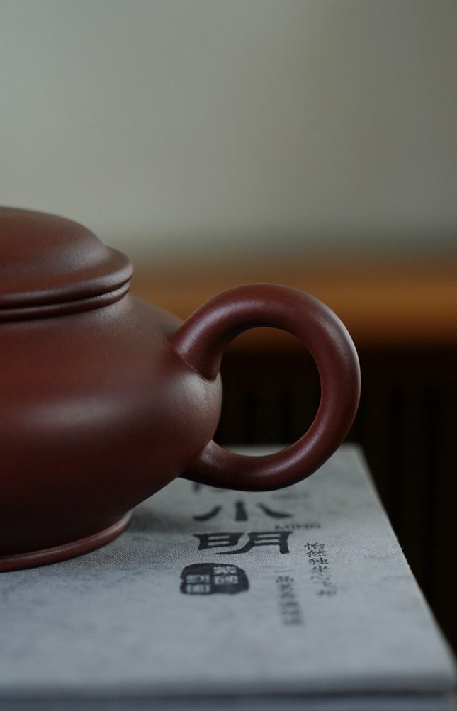 此壶造型简约至极,却于细微处见真章。整体轮廓流畅舒缓,盖面微鼓,如穹庐含蓄蕴藉,与扁圆壶身浑然一体,毫无突兀之感。壶嘴的处理尤为精妙,出水利落果断,嘴头略作下沉,不仅利于出水断水,更在视觉上形成了优雅的平衡与延伸。一弯流与圆弧把前后呼应,勾勒出宁静而富有张力的空间姿态,所谓“造型不虚”,正是在这虚与实的巧妙拿捏中得以体现。