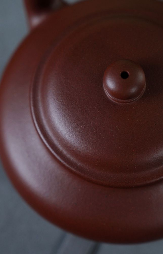 紫砂艺术浩瀚如海,其中虚扁一式,以独特的扁圆构型卓然而立,历来被视为制壶技艺的一大考验。在众多壶式中,虚扁的成形难度极高,其形须扁而不塌,气韵饱满,方能成就。陈赟先生此番以「景舟虚扁」为范,取上乘老紫泥为骨,精心抟筑225cc之容,正是向这一经典形制的诚挚致敬。泥色温润淳厚,经年窑火淬炼,更显深沉古雅之气,仿佛将时光凝驻于壶身。