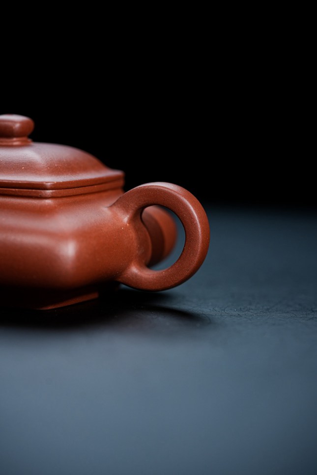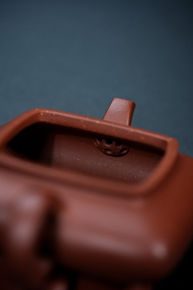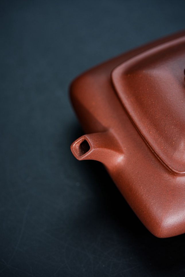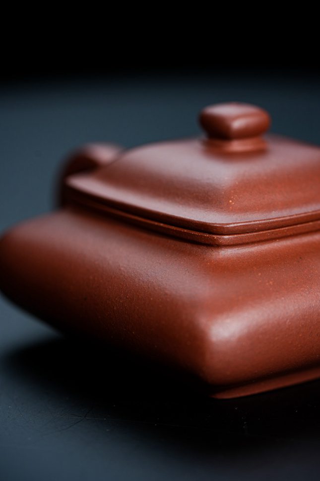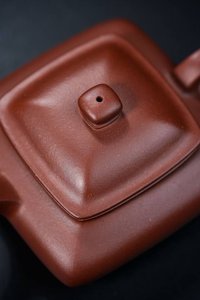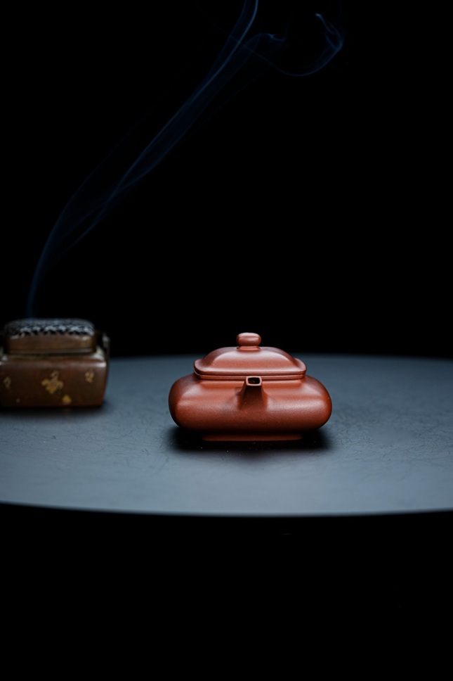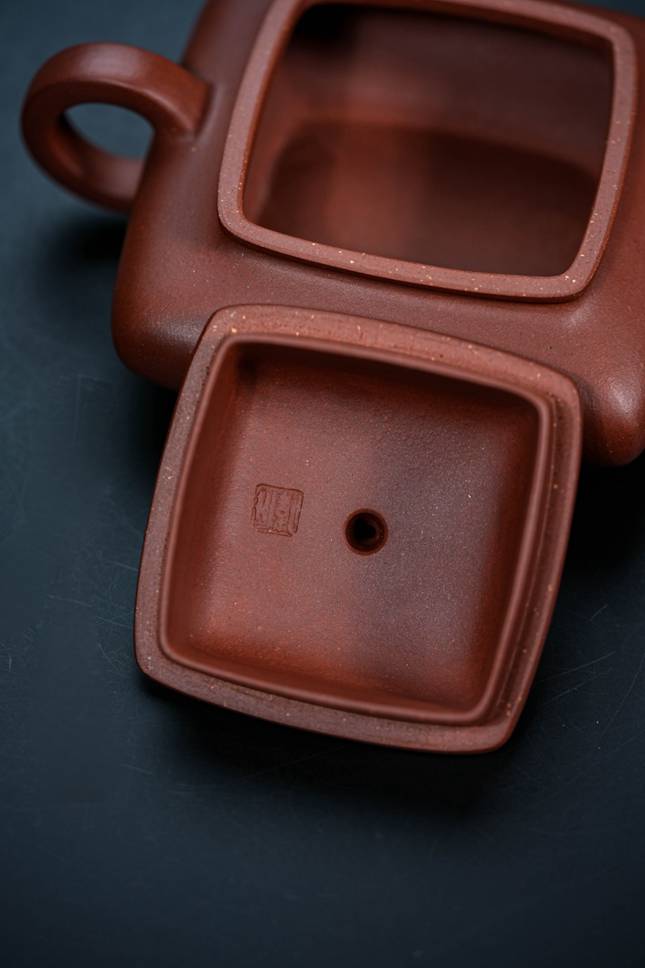 此壶容量约190cc,形制上融汇四方虚扁之精髓。壶身鼓腹饱满,上下渐次收敛,线条过渡流畅自然。通体处处细捶精工,展现出严谨的制器态度。壶纽塑以浑方之态,四面昂然挺立,于细微处见精神。壶嘴与壶把的设计尤为巧妙,前者微缩蓄势,后者垂延舒展,前后呼应,形成一种如奔马欲驰又静立于瞬的动感姿态,令整器静中有动,气韵生动。
