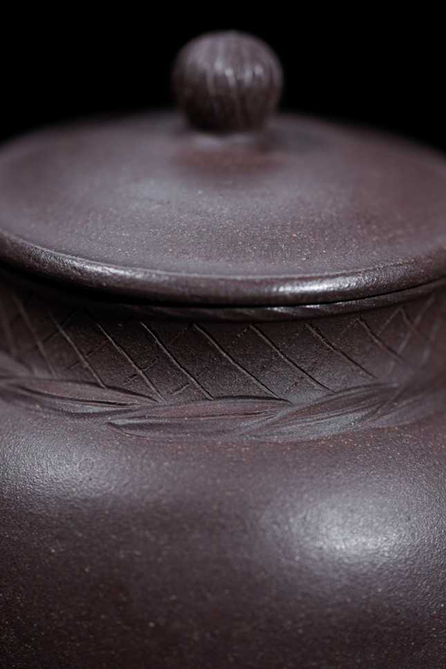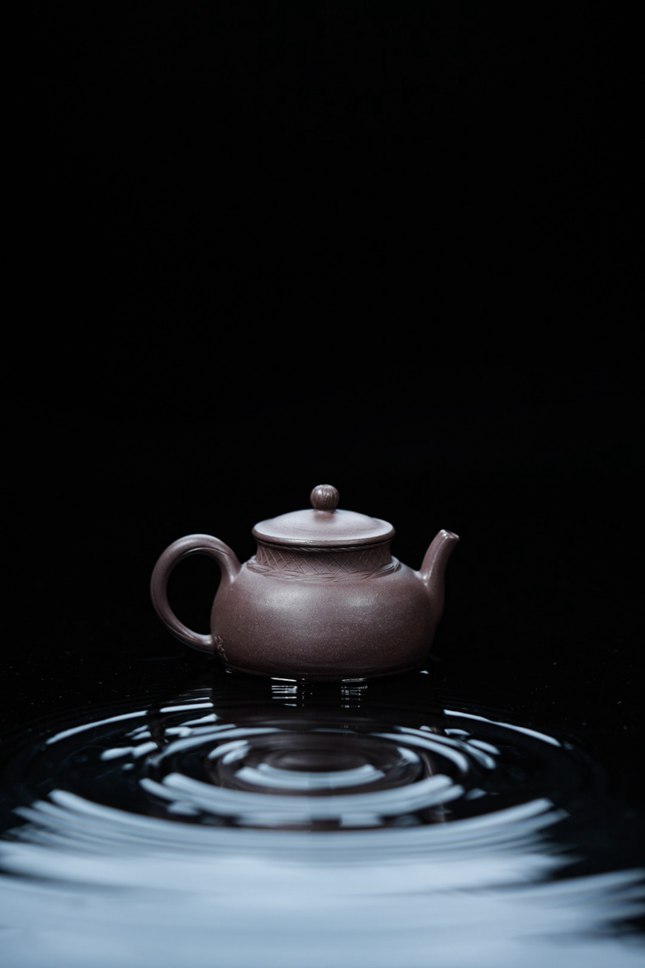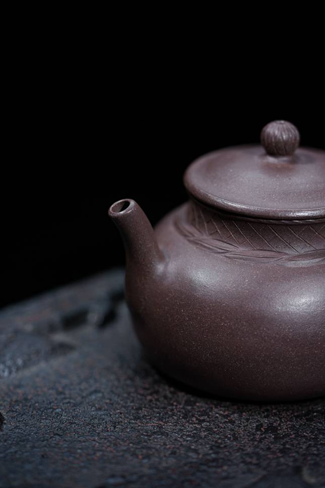茶烟袅袅升起时,案头便漫开了十里江渚的意境。国家级工艺美术师董俊峰,以紫泥为水,以匠心为舟,塑就这把名为「渔」的紫砂小品。饱满圆融的壶身,仿若渔舟静泊的船舱,紫泥温润,砂粒隐现,触手间是日光浸透木质的暖意;盖沿处手工摹刻的菱格纹,经纬交错,恰似收拢的渔网,糙朴肌理中诉说着江湖岁月的故事。