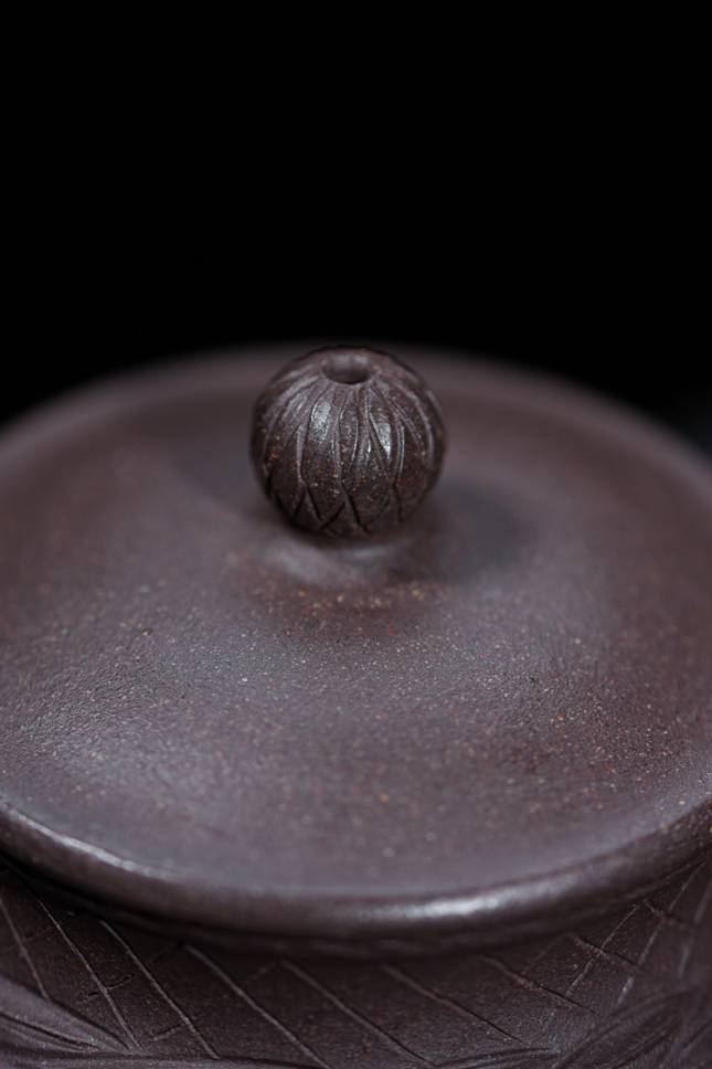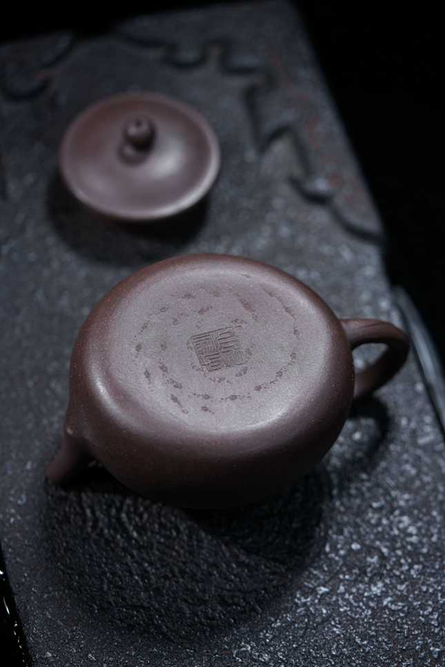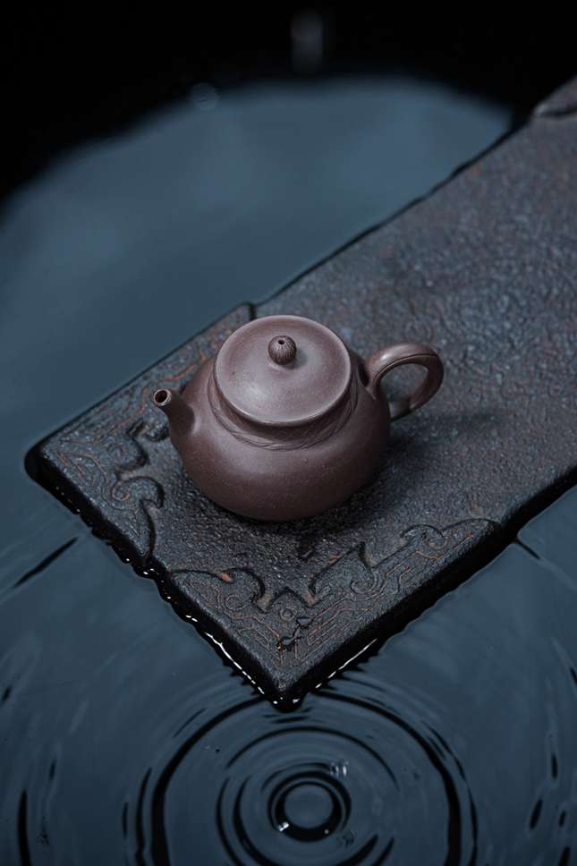 壶钮悄然化作一枚莲蓬,垂首而立,仿佛渔父晚归时不经意携回的荷实,平添一抹“渔樵江渚”的天然意趣。短流蓄势而发,如收束的钓竿;圈把流转自如,似盘绕的舟缆。执握于掌,线条贴合,是人与器之间一份无需言喻的妥帖。这二百毫升的天地,不争不显,只为安放一盏茶的宁静。