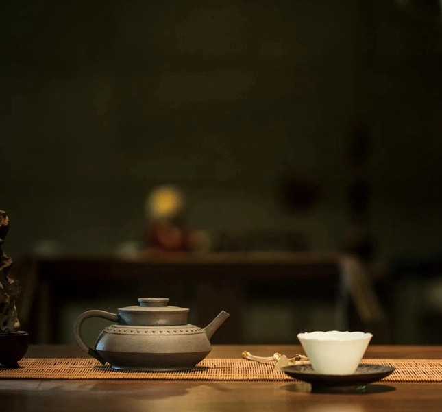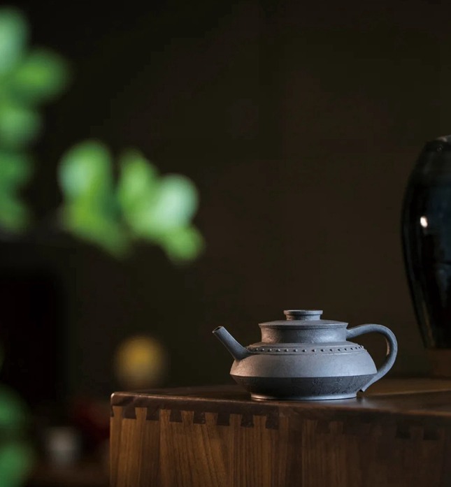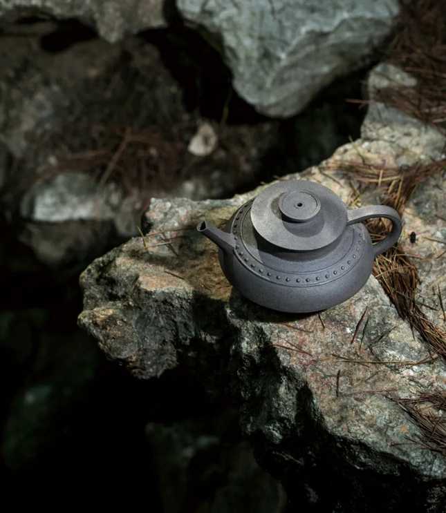 釜,是吉金系列的第九式,虽大观为青铜食器-釜所演化,其实亦是紫砂的传统手工艺与现代设计的完美融合。我们从形体构造的角度去分析,取青铜釜的轮廓造演,分之层次,以圆衬圆却丝毫不见滞态或小气,而愈显敦厚凝重,再加肩部一圈乳钉纹点缀,乳钉纹边缘的铸态配合整器表面的肌理,粝而不糙,恰以提气势。突出了青铜的神秘和精美感。